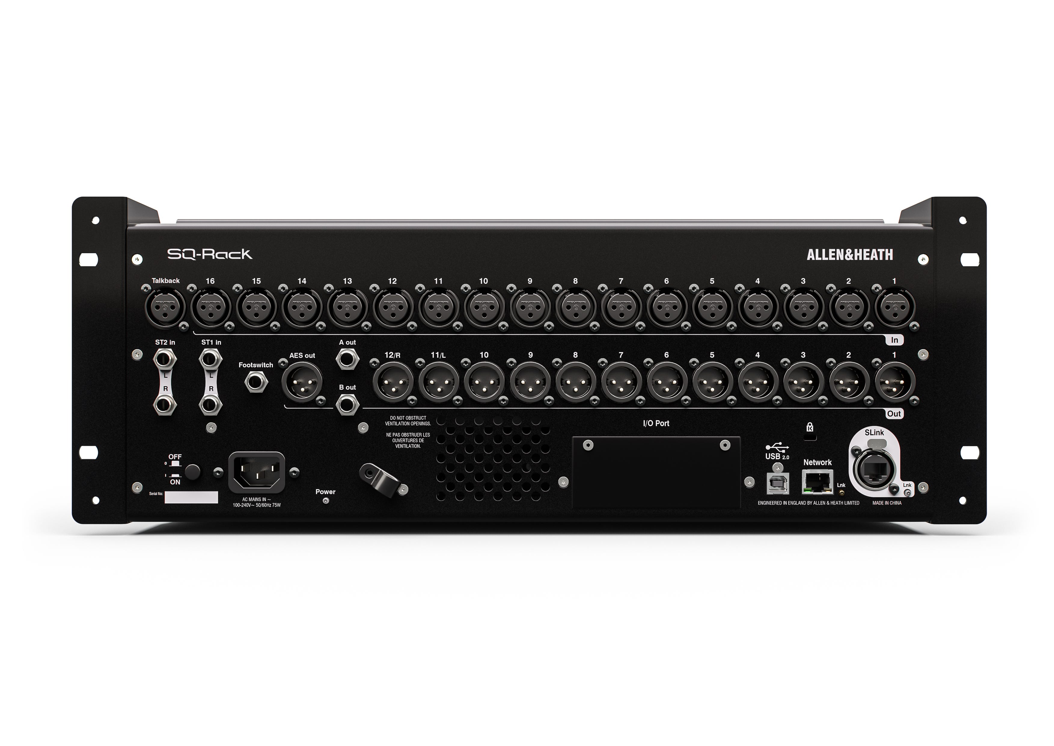 SQ-Rack har 16 høykvalitets innebygde mikrofonforforsterkere og 3 stereolinjeinnganger, og takket være den integrerte SLink-porten er det enkelt å legge til flere innganger og utganger. Opptil 48 mikrofoninnganger kan legges til via Allen & Heaths omfattende "Everything I/O"-serie av lydutvidere.