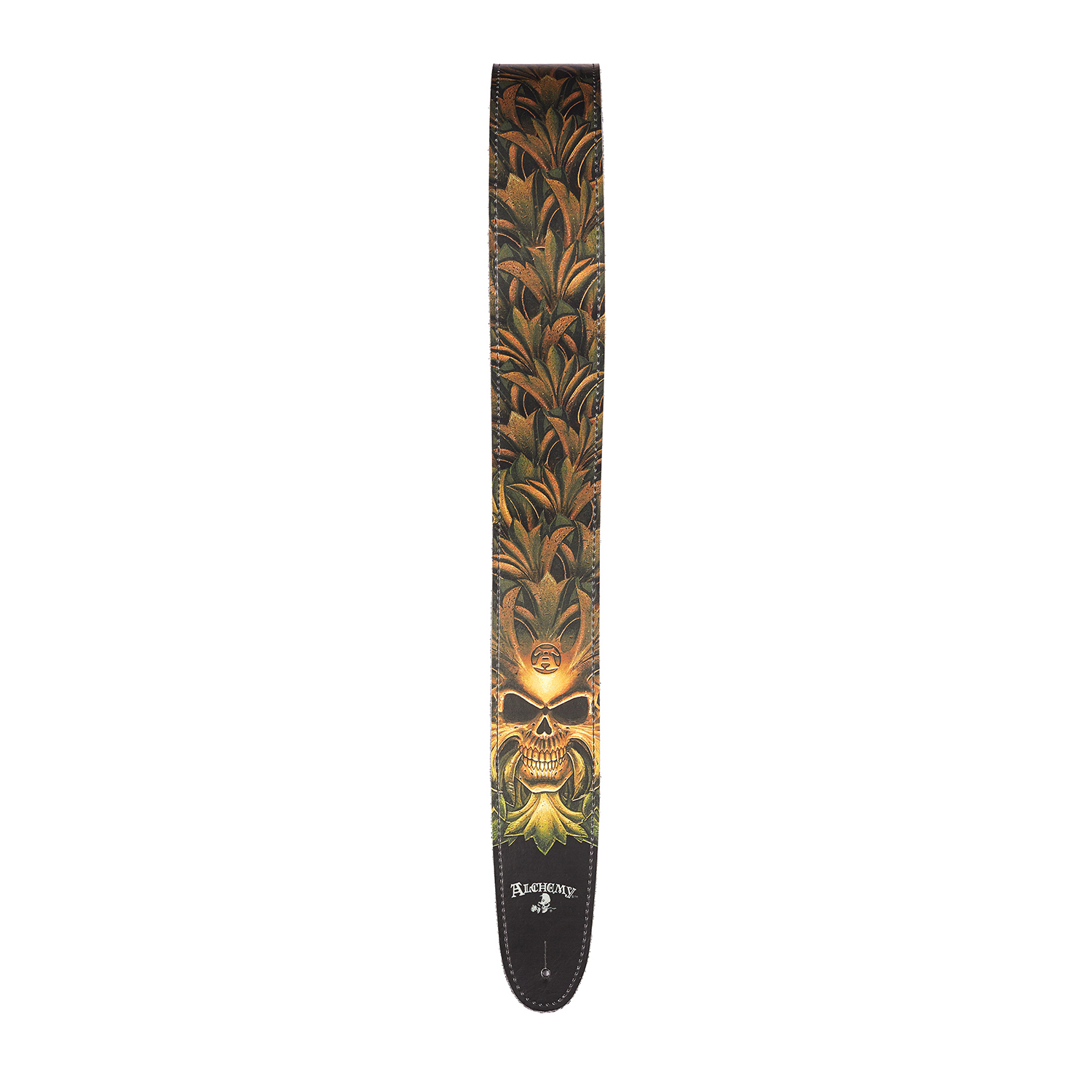 25LAL04 - Alchemy Gothic - Leather - Green Skull. Siden 1977 har Alchemy Gothic vært ledende innen gotiske smykker, kunst og livsstilsprodukter. Alchemy Gothic er designet og produsert i deres verksted i Leicester, England og de har samlet en utrolig samling autentisk gotisk-, mytologisk- og fantasikunst. Denne forbløffende kunsten presenteres nå i denne offisielt lisensierte gitarreim-kolleksjonen. • Justerbar lengde fra 115cm til 138cm. • Bredde 64mm. • Alchemy Design.