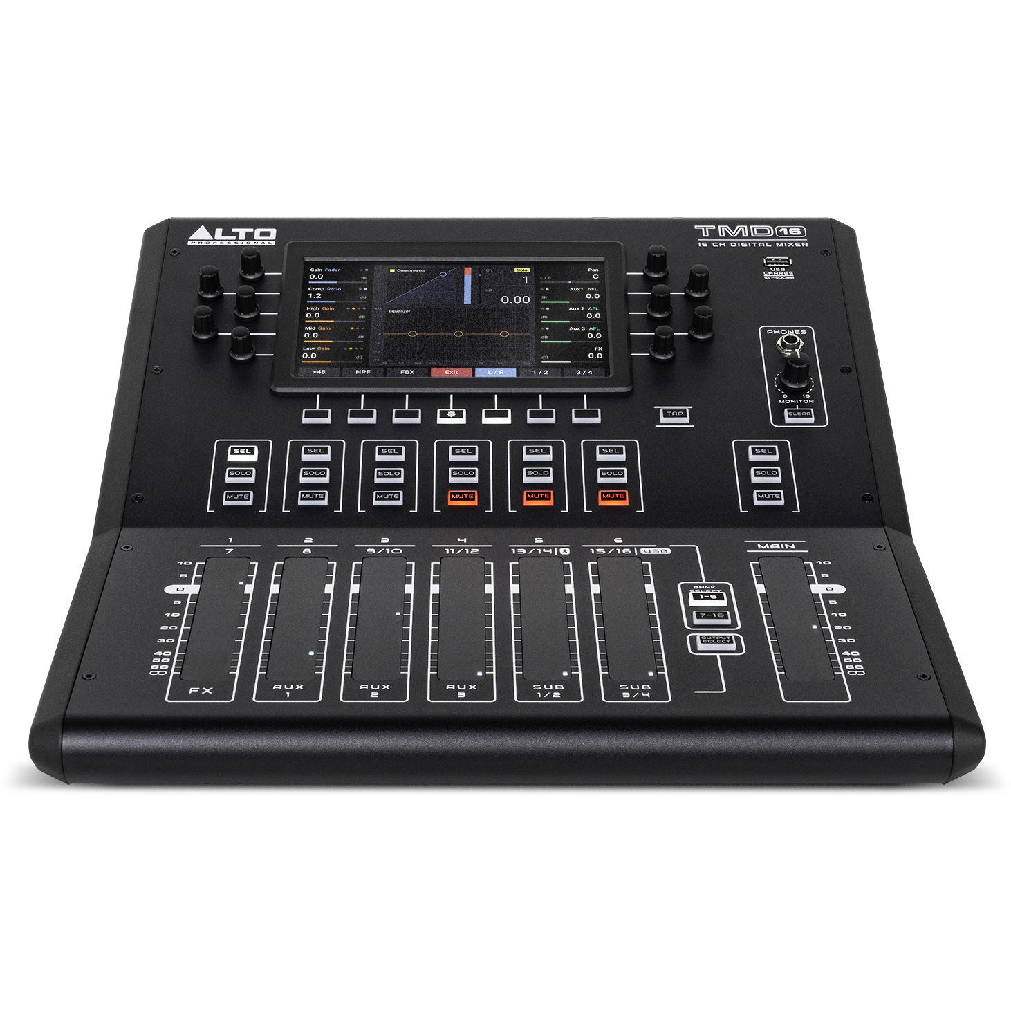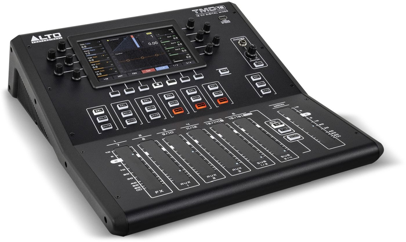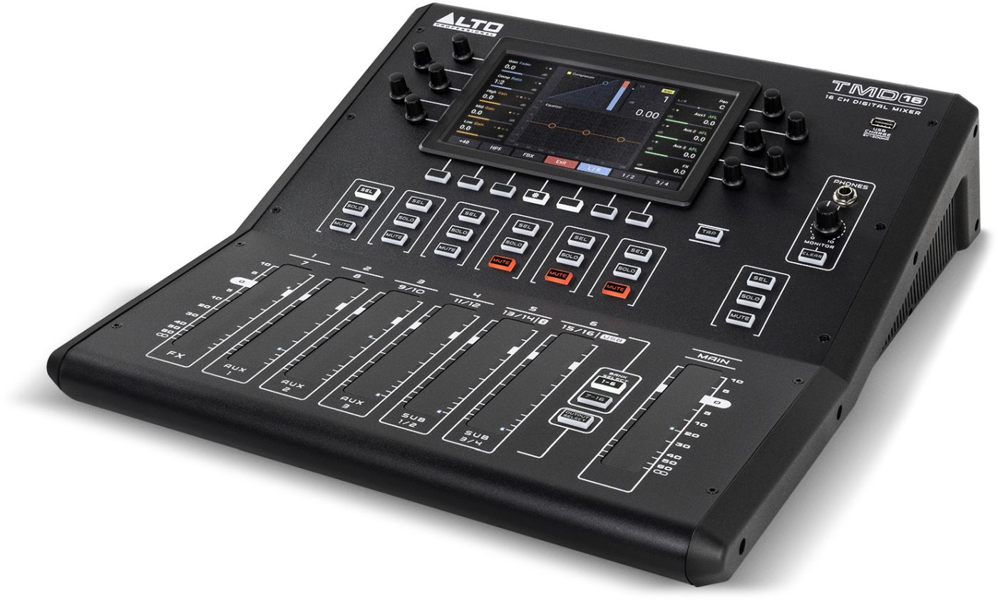 Alto TMD16 er en kompakt og brukervennlig digitalmikser med 16 kanaler, designet for live-lyd, øvingsrom, arrangementer og innspillingsmiljøer. Med intuitive berøringsfølsomme faderkontroller og dedikerte trykk-/rotasjonsknapper får du direkte tilgang til alle funksjoner, inkludert EQ, kompressor og effekter, uten å måtte navigere i komplekse menyer.