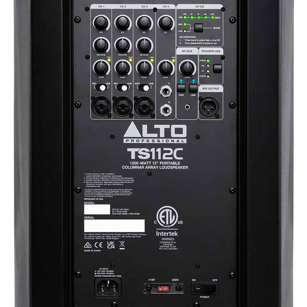 TS112C fungerer som et komplett PA-system med en innebygd 5-kanals mikser med innganger for mikrofoner, instrumenter og andre eksterne lydkilder. Du kan enkelt justere lyden og din personlige miks direkte fra mobilen via Alto Pro-appen.