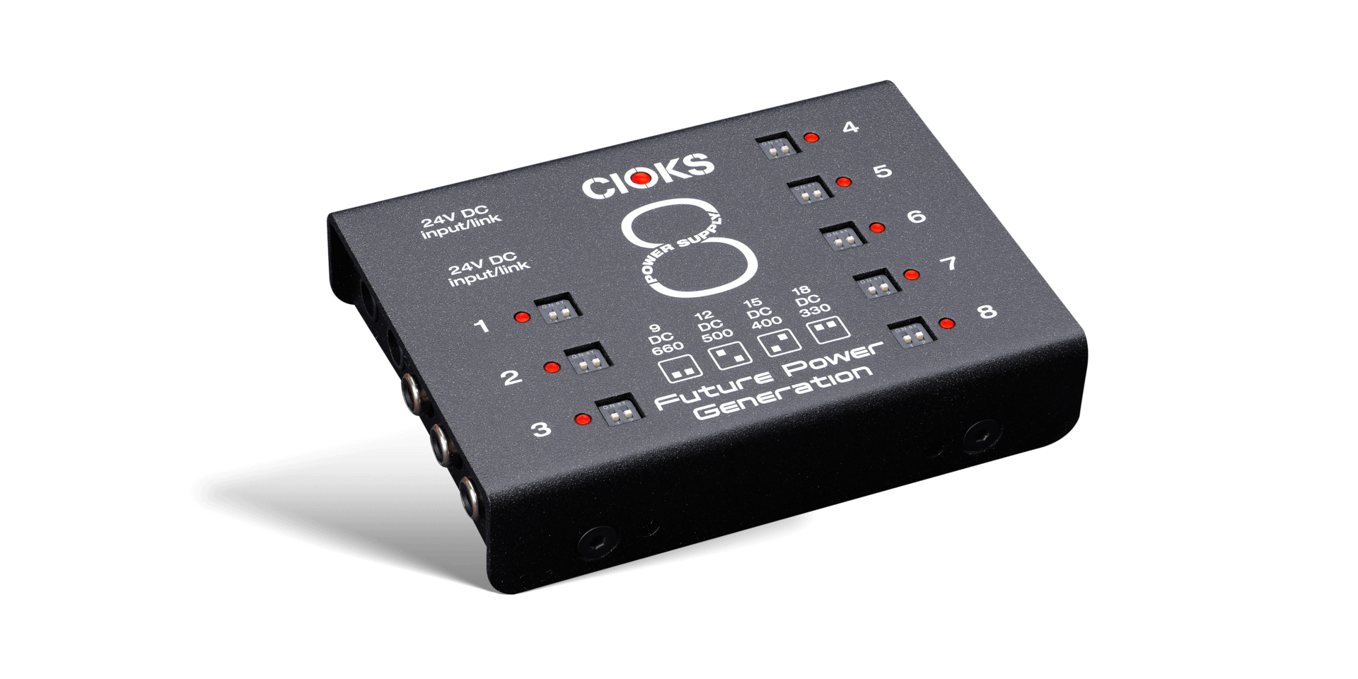 Enheten har åtte fullstendig isolerte DC-utganger, hvor hver utgang leverer opptil 660 mA ved 9 V. Samtlige utganger har fire valgbare spenninger – 9 V, 12 V, 15 V og 18 V – noe som gjør Cioks 8 Expander godt egnet for både standard pedaler og mer strømkrevende digitale effekter. Med samme slanke 1-tommers profil som DC7 passer den enkelt under de fleste pedalbrett.