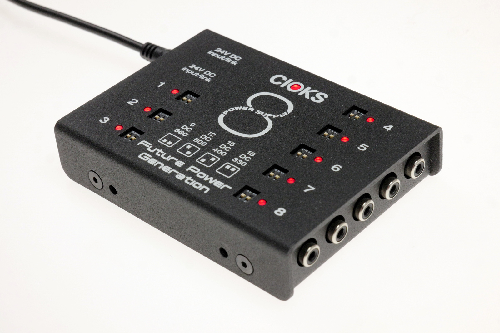 Cioks 8 benytter avansert multistage-filtrering for ultralav støy og har global overload-indikator for trygg og stabil drift. Den leveres med omfattende monteringsutstyr og Flex-kabler, og kan monteres under Pedaltrain-brett med Cioks GRIP-løsning. Sammen med DC7 gir den totalt 15 isolerte utganger med fire valgbare spenninger per utgang, samt tilgang til 5 V USB-utgang via DC7.