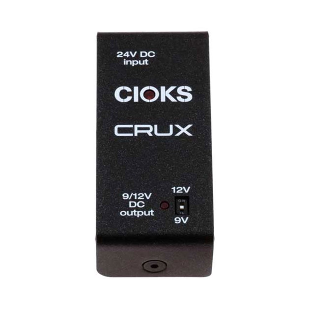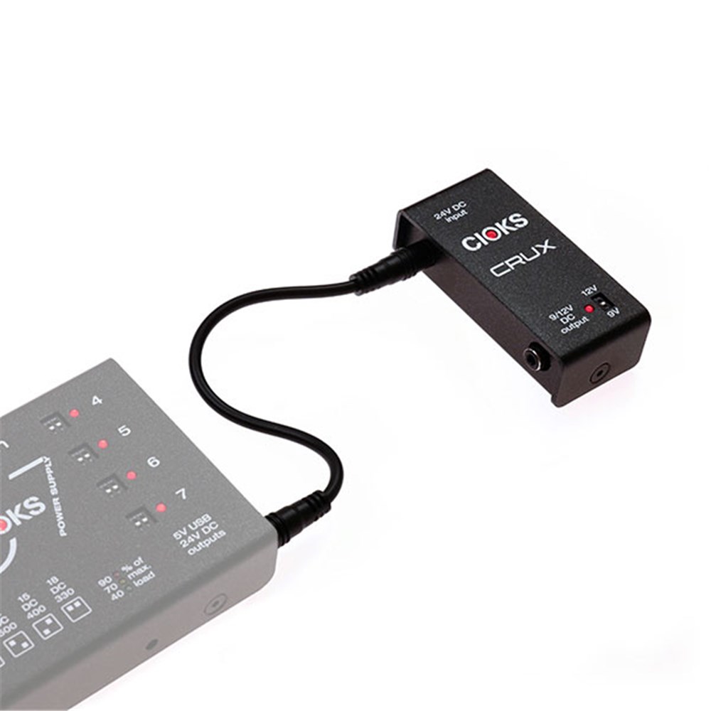 CIOKS CRUX er utviklet som et dedikert tillegg til Cioks DC7 for bruk med strømkrevende multieffektpedaler som Neural DSP Quad Cortex, Line 6 HX-serien og tilsvarende enheter. Ved å utnytte 24 V AUX-utgangen på DC7 gir Crux en enkel og ryddig løsning for å levere høy effekt uten å oppta flere av de vanlige DC-utgangene.