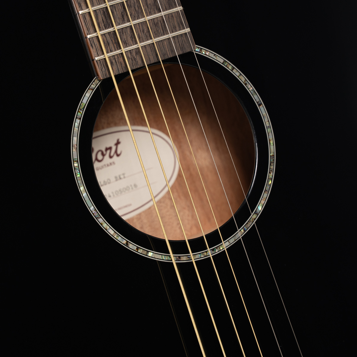 L 60 CE BK er utstyrt med Cort CE304T preamp med 3-bånds EQ og innebygd tuner, noe som gjør gitaren klar for både scene og øving. Finish i Black Gloss gir et moderne og nøkternt uttrykk, supplert av sort binding og rosett.