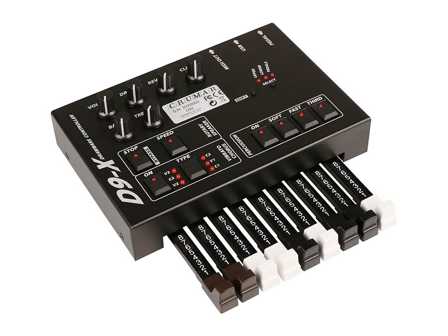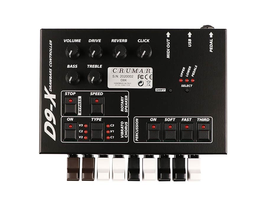D9X is the "extended" 9-drawbar controller, with all buttons and knobs that you need for full hands-on control of your clonewheel software or hardware module. Compatible with Crumar Mojo / Mojo61, GSi VB3-II and many other products.