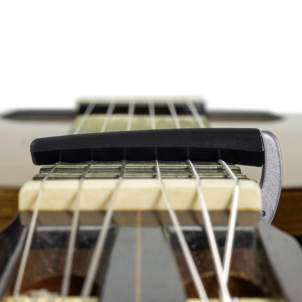PW-CP-19 - D'Addario Pro Plus Capo Silver. En capo som fungerer perfekt for alle gitarer! D'Addarios revolusjonerende FlexFit-teknologi gjør dette mulig. Capoen er designet for å gi nøyaktig samme jevne trykk som en finger over gripebrettet og tilpasser seg automatisk til din gitars radius. Uønskede døde toner og skurring er nå saga blott. Perfekt intonasjon garanteres om du så spiller nylonstrengers-, stålstrengers- eller elektrisk gitar. • Flexfit teknologien tilpasser seg automatisk din gitar. • Passer også 12-strengsgitarer. • Optimalt trykk på hver streng for perfekt intonasjon. • Finnes i svart og sølv finnish. • Ned Steinberger design.