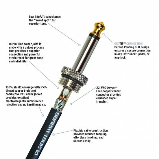 PW-AMSK-30. Instrumentkabel 9m. Kill Switch kontakt med signalbryter. Ved å trykke på Kill Switch knappen brytes signalet. Du unngår poppelyder og overbelastning, og du trenger ikke å senke volumet på forsterkeren når du bytter gitar. D'Addario American Stage Series kabler er designet for å gjengi den naturlige lyden til instrumentet uten noen som helst forstyrrelser i lyden . Med audiofil kvalitetskabel, produsert i USA, er dens lave kapasitans 28 pF/ft hovedpunktet for en ufarget tone. 22AWG syreresistent kobberleder garanterer eksepsjonell signaloverføring. Full beskyttelse oppnås ved bruk av 95% fortinnet kobberfletting som effektivt eliminerer forstyrrelser. Skreddersydd fra de fineste materialene, skrudd sammen med presisjon i USA, dette er en kabel for deg som vil ha en helt ren og ufarget tone! • Kill Switch signalbryter. • Eksklusiv In = Out teknologi: Det du plugger inn er det du hører komme ut. • Patentert Geo-Tip design garanterer en stabil tilkobling i alle instrumenter, jack, forsterkere, pedaler, etc. • Faste loddetilkoblinger for suveren kontakt og holdbarhet. • Neutrik kontakter, laget i Liechtenstein, etter D'Addarios patenterte design. • Livstidsgaranti på funksjons- og produksjonsfeil. For mer info, www.planetwaves.com/warranty