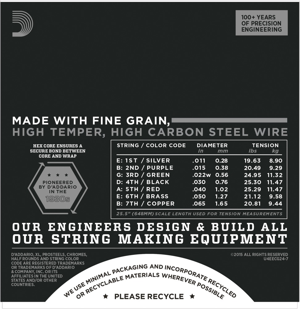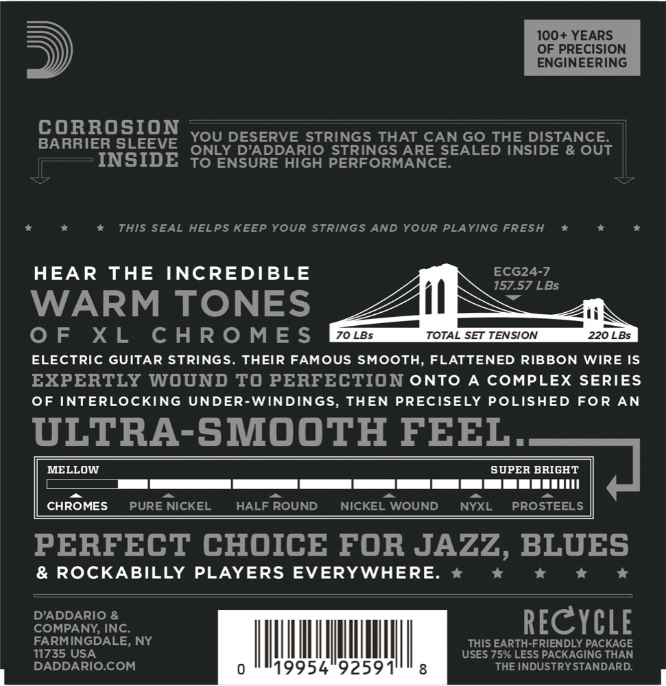 ECG24-7 Jazz Light 7-strengs 011 015 022w 030w 040w 050w 065w Dette er en streng som er strukturert av samme materiale som den populære EXL-serien, dvs en nikkelbelagt spinning på en hexagonal kjerne. Den største forskjellen er at etter spinningsprosessen poleres hver streng i 3 steg for å få en unik glatt og jevn overflate. Det gir en myk tone som er godt likt av jazzmusikere. Både Pat Metheny og John Scofield bruker D'Addario Chromes strenger på sine Ibanez signaturgitarer.
