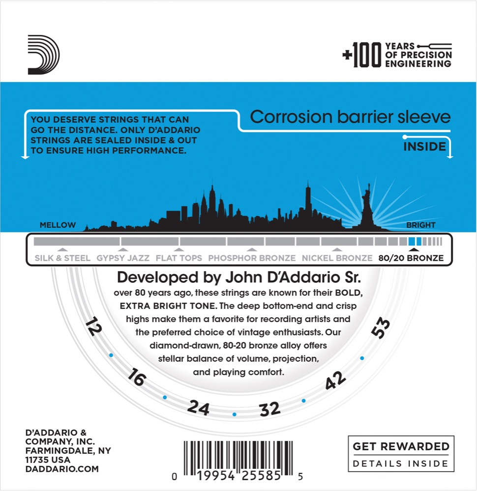 D'Addario EJ11-3D 80/20 Bronze Acoustic Guitar Strings, Light, 12-53, 3 Sets