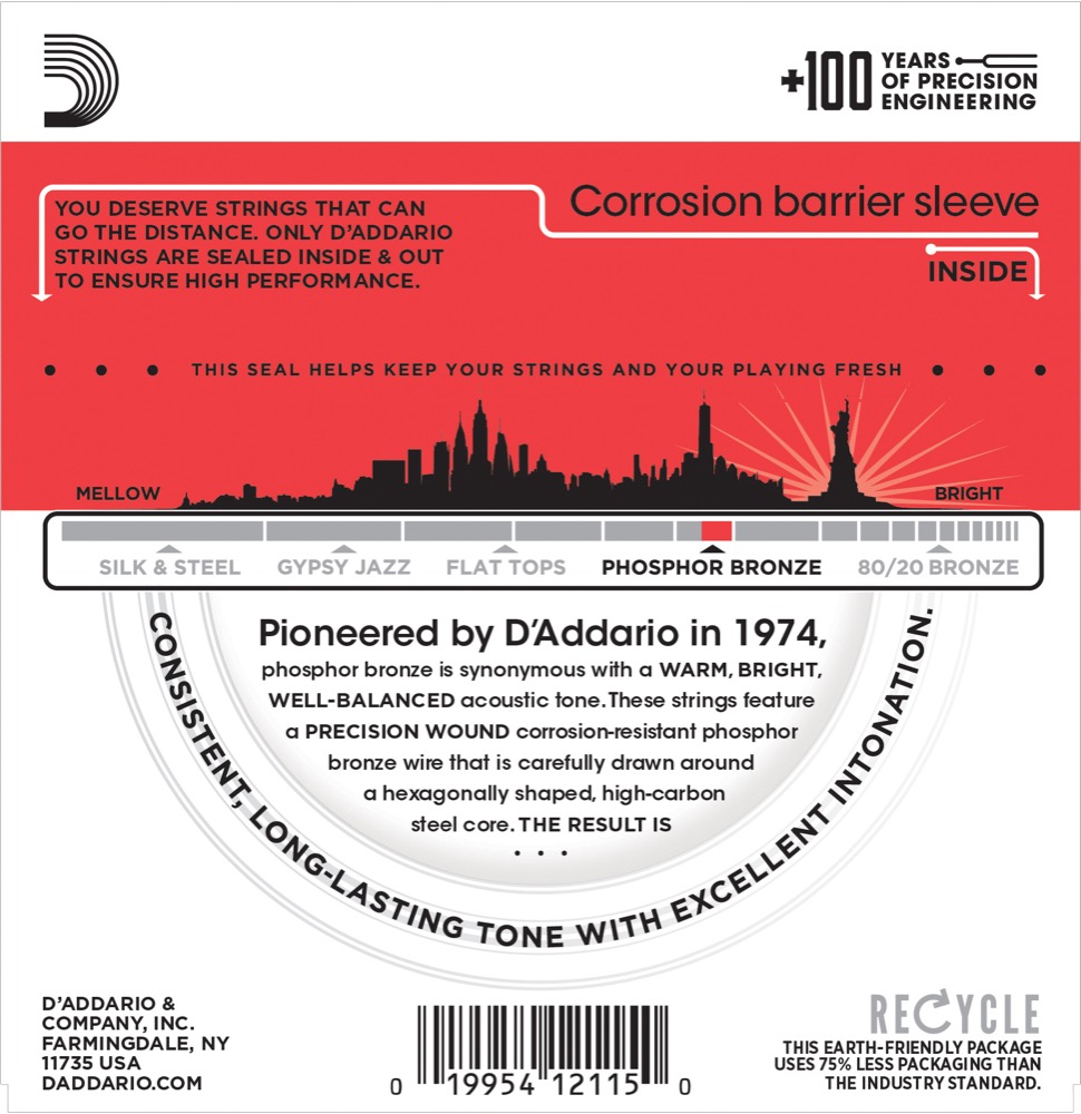 EJ17 Medium 013 017 026w 035w 045w 056w 1974 var året da D'Addario var først med å prøve materialet Phosphor Bronze i sin produksjon av akustiske strenger. Suksessen var et faktum og Phosphor Bronze strenger har blitt synonymt med en stor tone og lang holdbarhet. Foretrekkes av de fleste musikere både live og i studio. Model Note Inch PL013 E .013 PL017 B .017 PB026 G .026 PB035 D .035 PB045 A .045 PB056 E .056