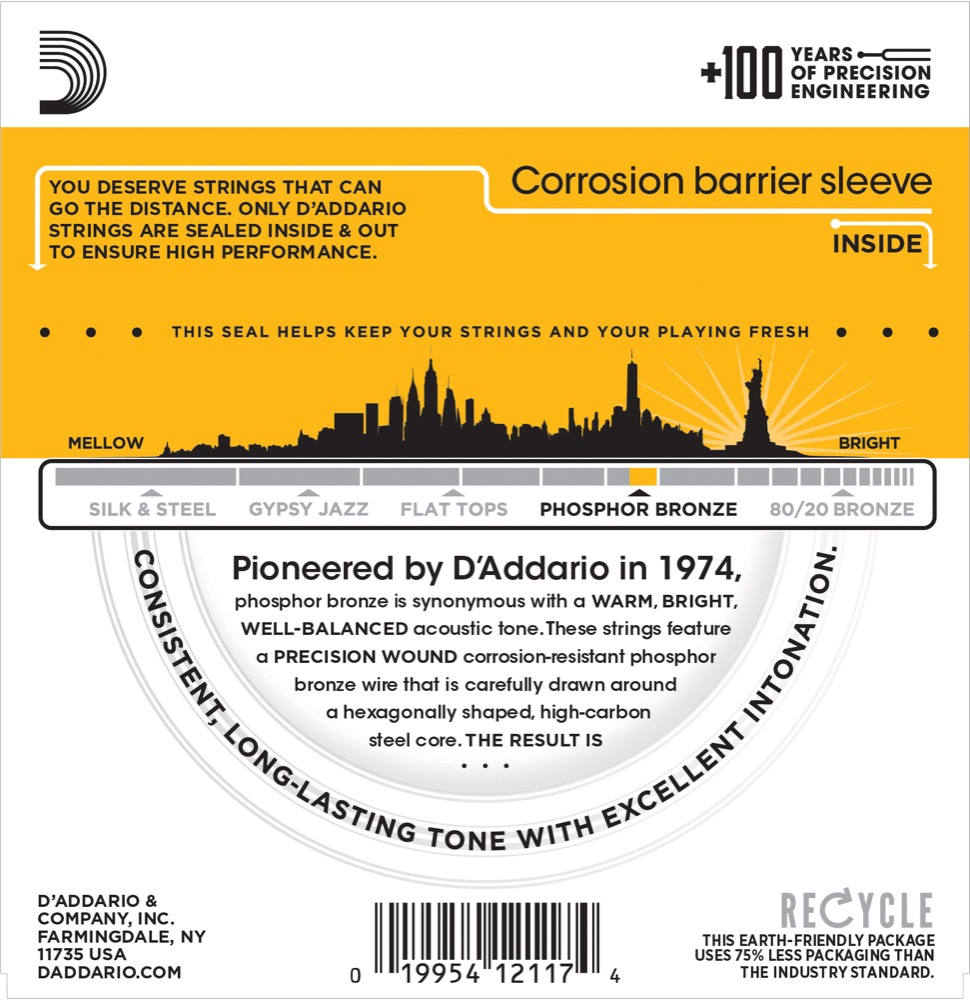 EJ19 Bluegrass. 1974 var året da D'Addario var først med å prøve materialet Phosphor Bronze i sin produksjon av akustiske strenger. Suksessen var et faktum og Phosphor Bronze strenger har blitt synonymt med en stor tone og lang holdbarhet. Foretrekkes av de fleste musikere både live og i studio. Model Note Inch PL012 E .012 PL016 B .016 PB025 G .025 PB035 D .035 PB045 A .045 PB056 E .056