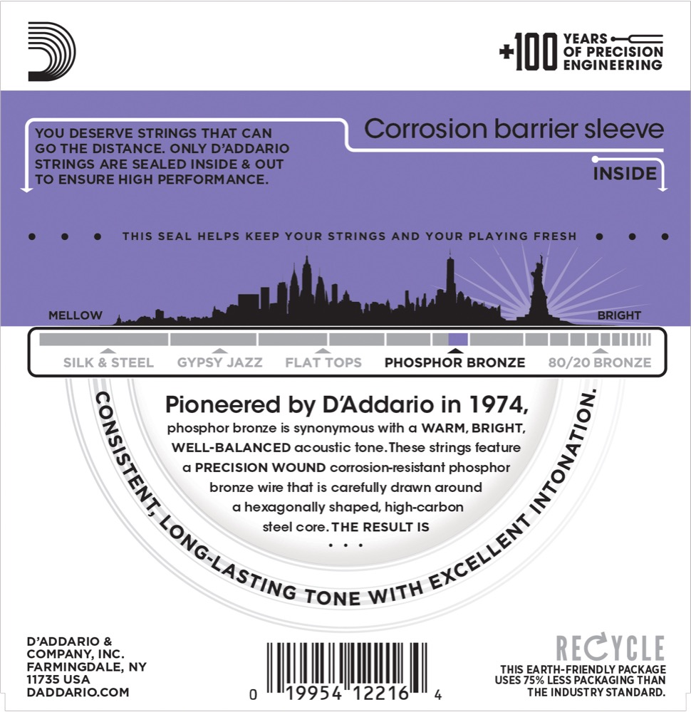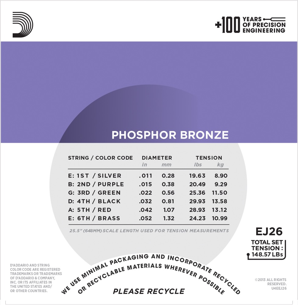 EJ26 Custom Light. 1974 var året da D'Addario var først med å prøve materialet Phosphor Bronze i sin produksjon av akustiske strenger. Suksessen var et faktum og Phosphor Bronze strenger har blitt synonymt med en stor tone og lang holdbarhet. Foretrekkes av de fleste musikere både live og i studio. Model Note Inch PL011 E .011 PL015 B .015 PB022 G .022 PB032 D .032 PB042 A .042 PB052 E .052