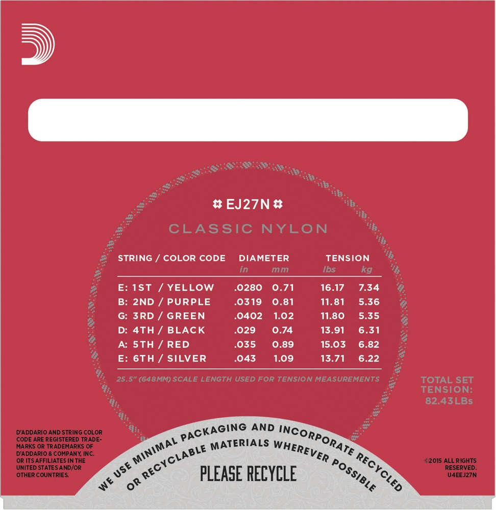 EJ27N Normal Silver/Clear 028 032 040 030w 035w 043w EJ27N er en standardstreng og D'Addarios billigste for klassiske gitarer. Passende for nybegynneren.