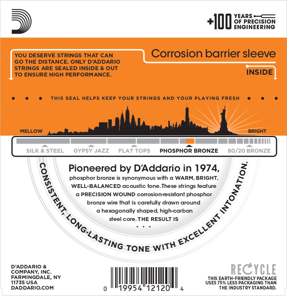 EJ41 Phosphor Bronze 12-str. X-Light Tykkelse 1-12: 009/009, 013/013, 021w/008, 029w/011, 036w/016, 045w/025w. 1974 var året da D'Addario var først med å prøve materialet Phosphor Bronze i sin produksjon av akustiske strenger. Suksessen var et faktum og Phosphor Bronze strenger har blitt synonymt med en stor tone og lang holdbarhet. Foretrekkes av de fleste musikere både live og i studio.