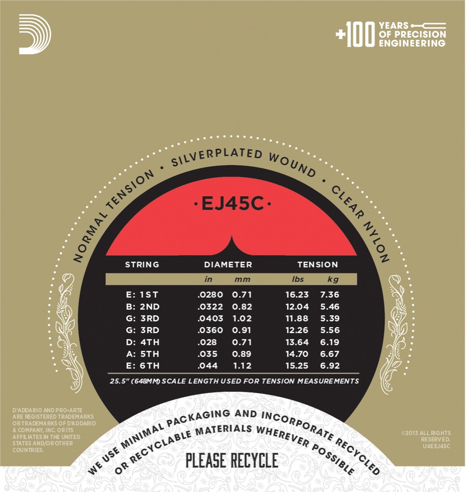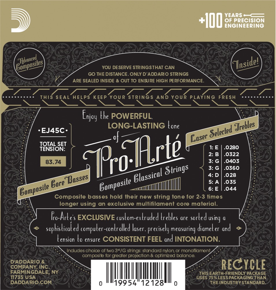 EJ45C Composite, Normal Tension. I Pro Arte Kompositen er G strengen og kjernen i basstrengene produsert i et polymermateriale, noe som gir en rik og kraftig tone med mye varme. I tillegg har basstrengene 2-3 ganger lengre leveperiode enn nylon og gir en perfekt toneovergang mellom de spunnede og uspunnede strengene. Med dette materialet kan også G strengen gjøres tynnere, uten å ofre styrke, noe som gir en betydelig klarere tone enn en normal nylonstreng. Disse settene holder stemmingen utrolig bra! • Sølvbelagt kobberspinning på en eksklusiv kompositkjerne, for kraftfull og varende tone. • G streng av kompositkjerne for økt projeksjon og holdbarhet. Alle lasersortert for absolutt jevn kvalitet. • Strengetykkelser: .0280, .0322, .0360, .028w, .035w, .044w. • Made in USA.