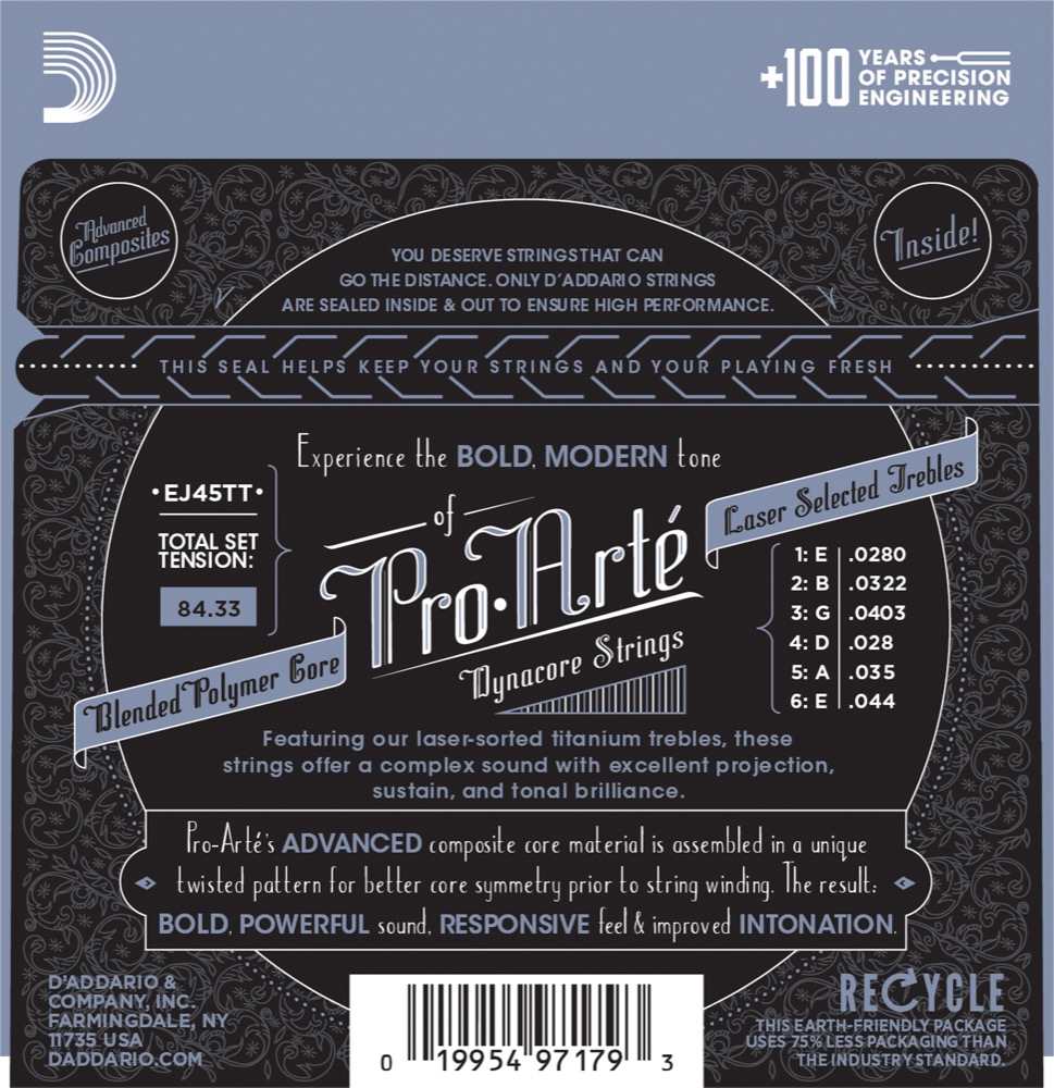 D'Addario EJ45TT ProArte Dynacore Classical Guitar Strings, Titanium Trebles, Normal Tension