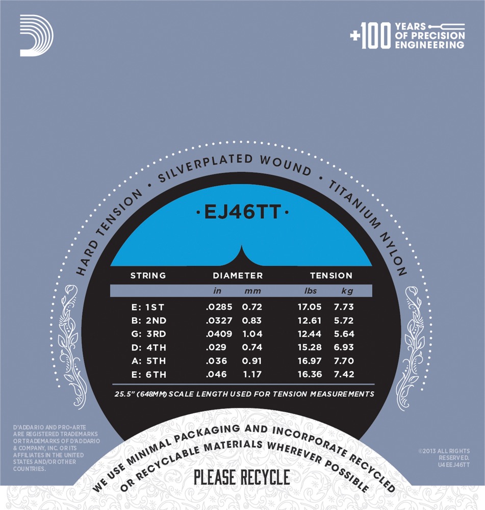 EJ46TT, Extra Hard Tension. D'Addario Dynacore er for klassisk gitar og med en fleksibel kompositkjerne som gir en kraftfull og fyldig tone. Diskantstrengene er produsert av et titaniumsmatriale for klarhet og tonal balanse. • Extra Hard Tension. • Dimensjoner: .0285, .0337, .041, .029, .036, .046. • Made in USA.