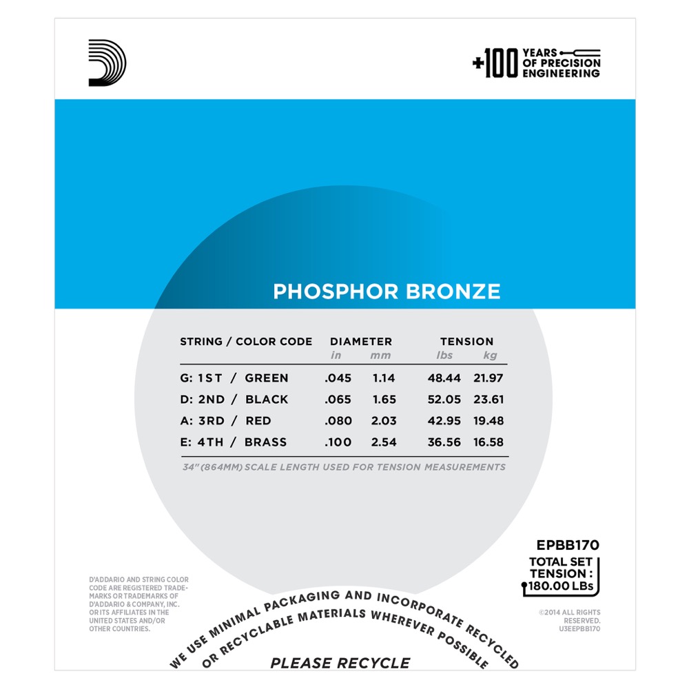 D'Addario EPBB170 Phosphor Bronze Acoustic Bass Strings, Long Scale, 45-100