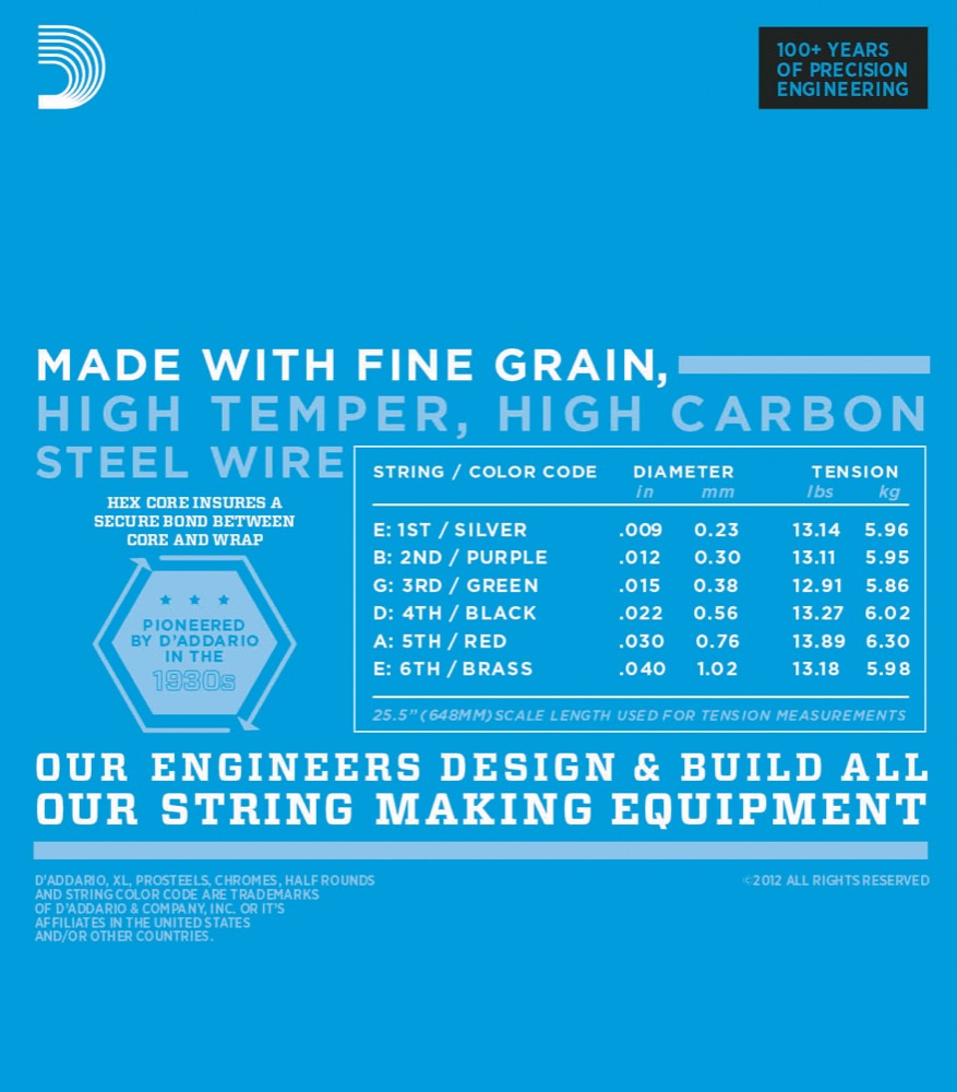 EXL120BT, D’Addario Balanced Tension er et sett utviklet med matematiske beregninger for å få en optimal kombinasjon av strengetykkelser. Eller med andre ord, en balansert spenning og balansert motstand på alle strenger når de er stemt til pitch. Denne tilsynelatende lille endring gir et strengesettt som kjennes jevnere og mere balansert å spille på, klinger jevnere uten toner som stikker seg ut eller drukner, samt at vibrato og bends blir bedre og tryggere av at hånden slipper å kompensere for ulik hardhet i strengene når du spiller. XL Nikkel Wound er D'Addarios mes brukte og likte el.gitarstreng. Nikkelkledd stål, presisjonsspunnet på en hexagonal kjerne av stål, gir en fleksibel streng med en distinkt og klar lydkarakter i kombinasjon med suveren intonasjon. • Balansert spenning for balansert spilleteknikk. • Spunnet streng med nikkelkledd stål for klar og distinkt tone. • Miljøvennlig og korrosjonsmotstandsdyktig forpakning holder strengene ferske. • Produsert av D'Addario i New York, USA for beste kvalitet. • Strengetykkelser: Plain Steel .009, .012, .015, Nikkel Wound .022, .030, .040.