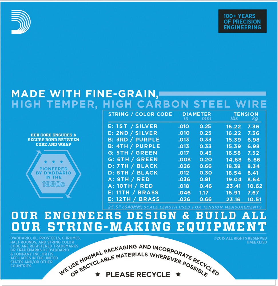 EXL150 Regular Light, 12-String. XL Nikkel Wound er D'Addarios mest brukte og likte el.gitarstreng. Nikkelbelagt stål, presisjonsspunnet på en hexagonal kjerne av stålkull, gir en fleksibel streng med en distinkt og klar lydkarakter i kombinasjon med suveren intonasjon. Helt siden fødselen på sekstitallet har gitarhelter innen alle sjangere valgt å bruke disse strengene på sine gitarer. • D'Addario's mest populære strengserie for el.gitar. • Uslipt spunnen streng med nikkelbelagt stål for klar og distinkt tone. • Miljøvennlig og korrosjonsmotstandsdyktig forpakning holder strengene ferske. • Produsert av D'Addario i New York, USA for beste kvalitet. • Strengetykkelser: 010/010, 013/013, 017/008,.026w/012p, 036w/018p, 046w/026w.