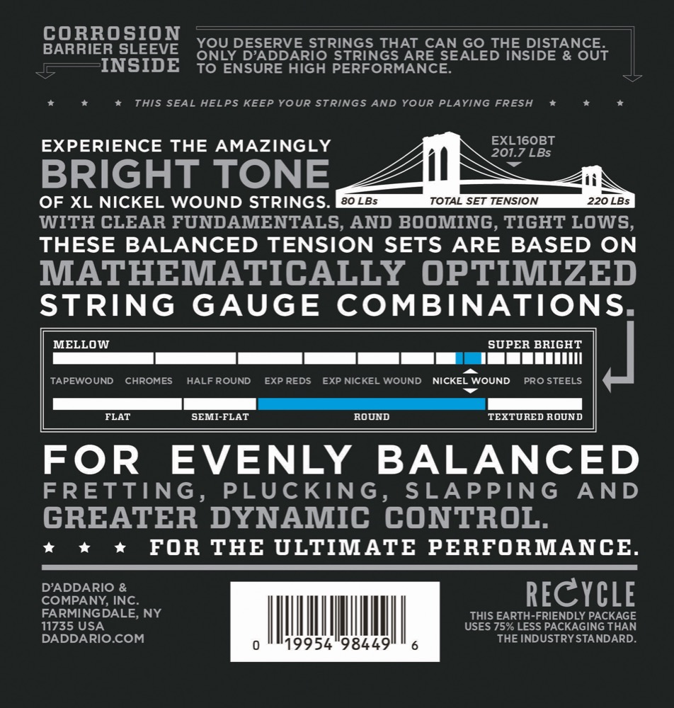 D'Addario EXL160BT Nickel Wound Bass Guitar Strings, Balanced Tension Medium, 50-120, Long Scale