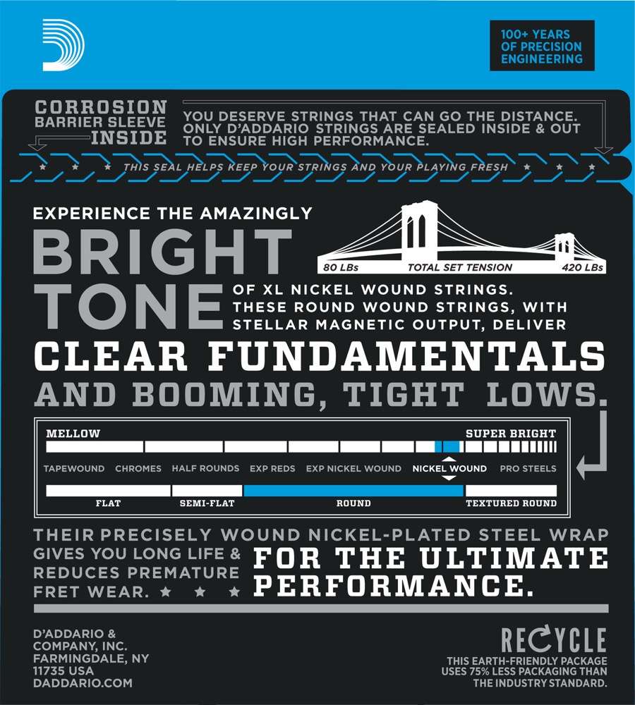 EXL280 Piccolo/Long Scale 020P 032 042 052. D’Addarios mest populære el.basstrenger. Nikkelbelagt stål gir et sterkt magnetisk utgangssignal og en komfortabel jevn spilleflate som reduserer for slitasje av gripebrettsbåndene. EXL-strengene har ett distinkt og klart sound og en perfekt intonasjon. Settet består av: • XLB020P G. • XLB032 D. • XLB042 A. • XLB052 E. Hvilken lengde (Scale) på strenger skal jeg velge? De fleste el.basser har Long Scale, men selvfølgelig finnes det unntak. Mål på bassiden når strengen er i pitch, avstanden fra kulens innside og til oversadelen. • Short Scale: Opp til 32 . • Medium Scale: 32 opp til 34 . • Long Scale; 34 upp til 36 . • Super Long: 36 opp til 38 .