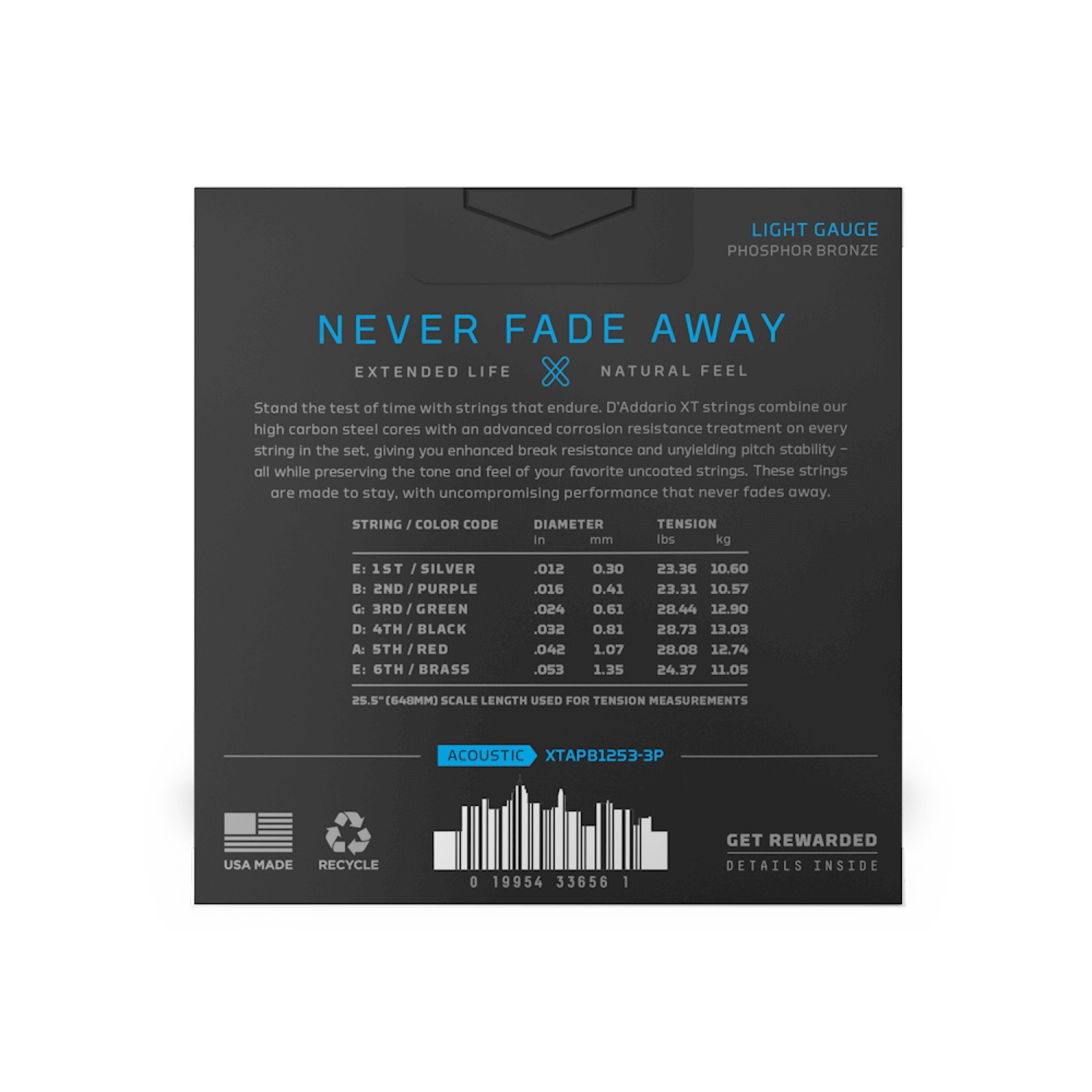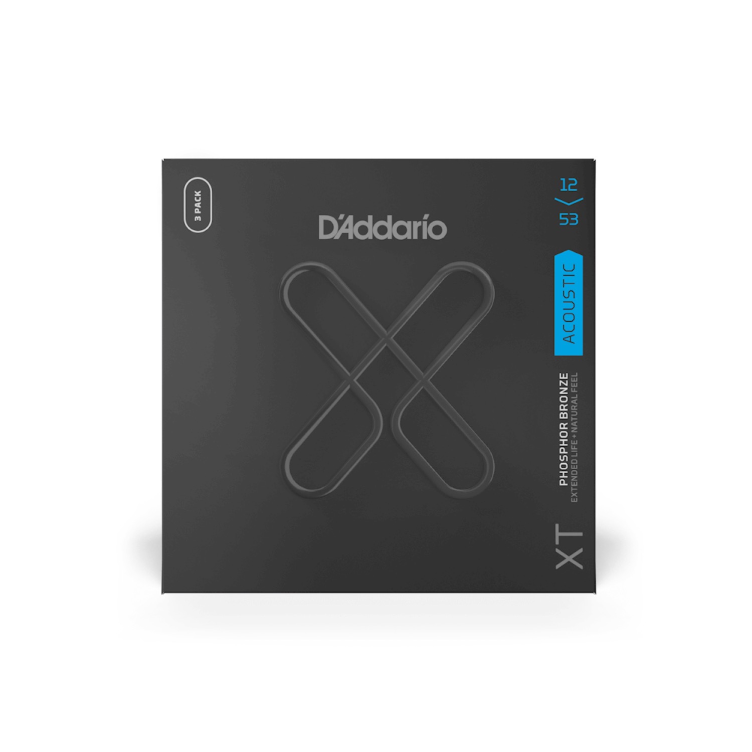 XTAPB1253-3P, Set Acoustic Guitar XT Phosphor Bronze 12-53, Regular Light. 3-pakk. Hver enkelte streng i et sett XT er behandlet med D'Addario's beskyttende microcoating. En supertynn overflatebehandling som effektivt støter bort smuss og svette. XT-strengene varer 4 ganger lengre enn tradisjonelle u-coatede strenger, uten å påvirke tonen eller spillefølelsen som D'Addario's strenger har blitt kjent for. D'Addario's unike karbonstålkjerne, i kombinasjon med en sterk forankring av kulen, såkalt Fusion Twist Technology, gir en streng med uovertruffen styrke og somholder stemmingen betraktelig bedre enn vanlige strenger. • D'Addario's mikroskopiske coating gjør at strengene kjennes ferske og holder tonen 4 ganger lengre. • Kjerne av karbonstål og ?'Fusion Twist'' forankring av kulen, for uovertruffen styrke og stemmingsstabilitet (opp til 42% sterkere og 131% bedre stemmingsstabilitet enn tradisjonelle strenger). • Forseglbar og korrosjonsresistent forpakning garanterer alltid et sett ferske strenger. • Utviklet og produsert til sin perfeksjon av D'Addario i New York, USA. • Plain Steel .012, .016, Phosphor Bronze Wound .024, .032, .042, .053. • Leveres i pakke med 3 sett.