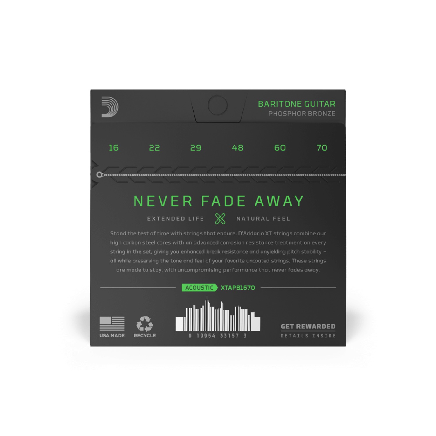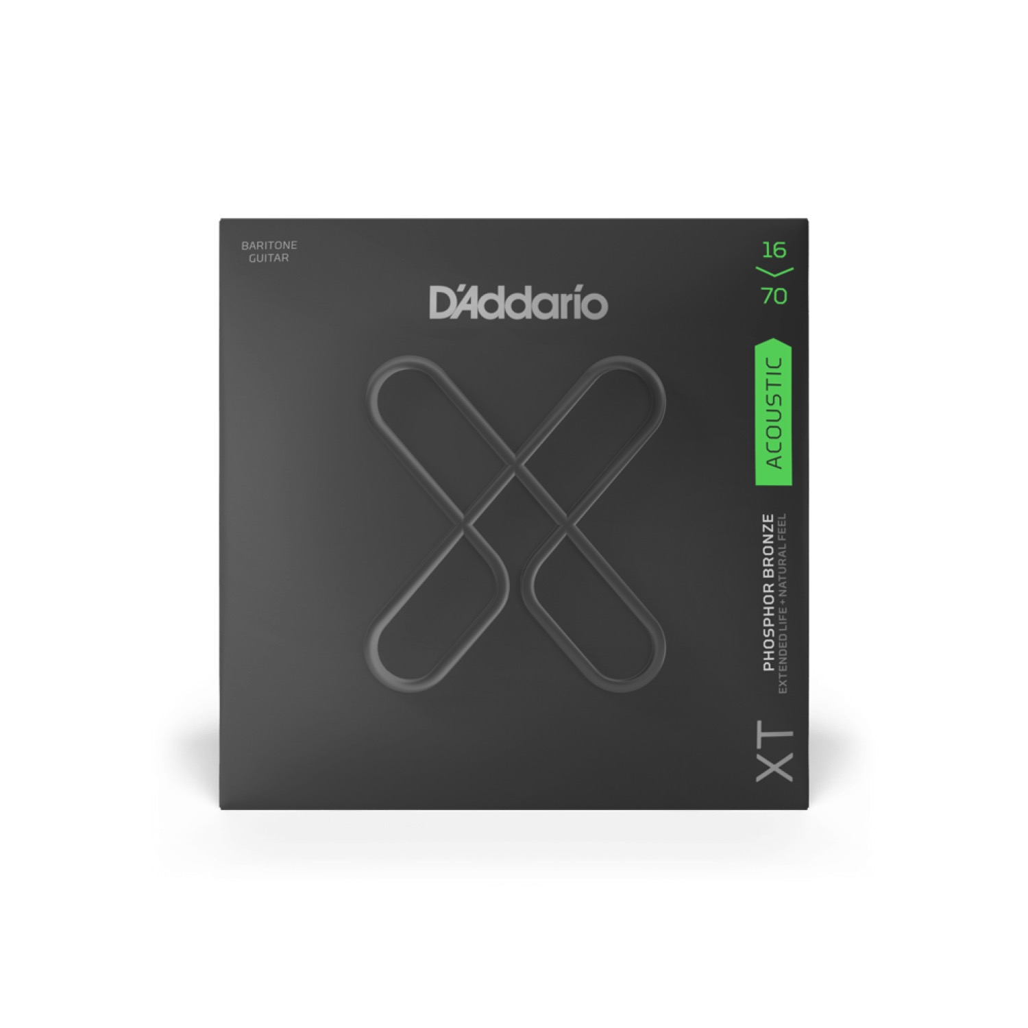XTAPB1670, Set Baritone Guitar XT Phosphor Bronze 16-70, Medium. Hver enkelte streng i et sett XT er behandlet med D'Addario's beskyttende microcoating. En supertynn overflatebehandling som effektivt støter bort smuss og svette. XT-strengene varer 4 ganger lengre enn tradisjonelle u-coatede strenger, uten å påvirke tonen eller spillefølelsen som D'Addario's strenger har blitt kjent for. D'Addario's unike karbonstålkjerne, i kombinasjon med en sterk forankring av kulen, såkalt Fusion Twist Technology, gir en streng med uovertruffen styrke og somholder stemmingen betraktelig bedre enn vanlige strenger. • D'Addario's mikroskopiske coating gjør at strengene kjennes ferske og holder tonen 4 ganger lengre. • Kjerne av karbonstål og ?'Fusion Twist'' forankring av kulen, for uovertruffen styrke og stemmingsstabilitet (opp til 42% sterkere og 131% bedre stemmingsstabilitet enn tradisjonelle strenger). • Forseglbar og korrosjonsresistent forpakning garanterer alltid et sett ferske strenger. • Utviklet og produsert til sin perfeksjon av D'Addario i New York, USA. • Plain Steel .016, .022, Phosphor Bronze Wound .029, .048, .060, .070.