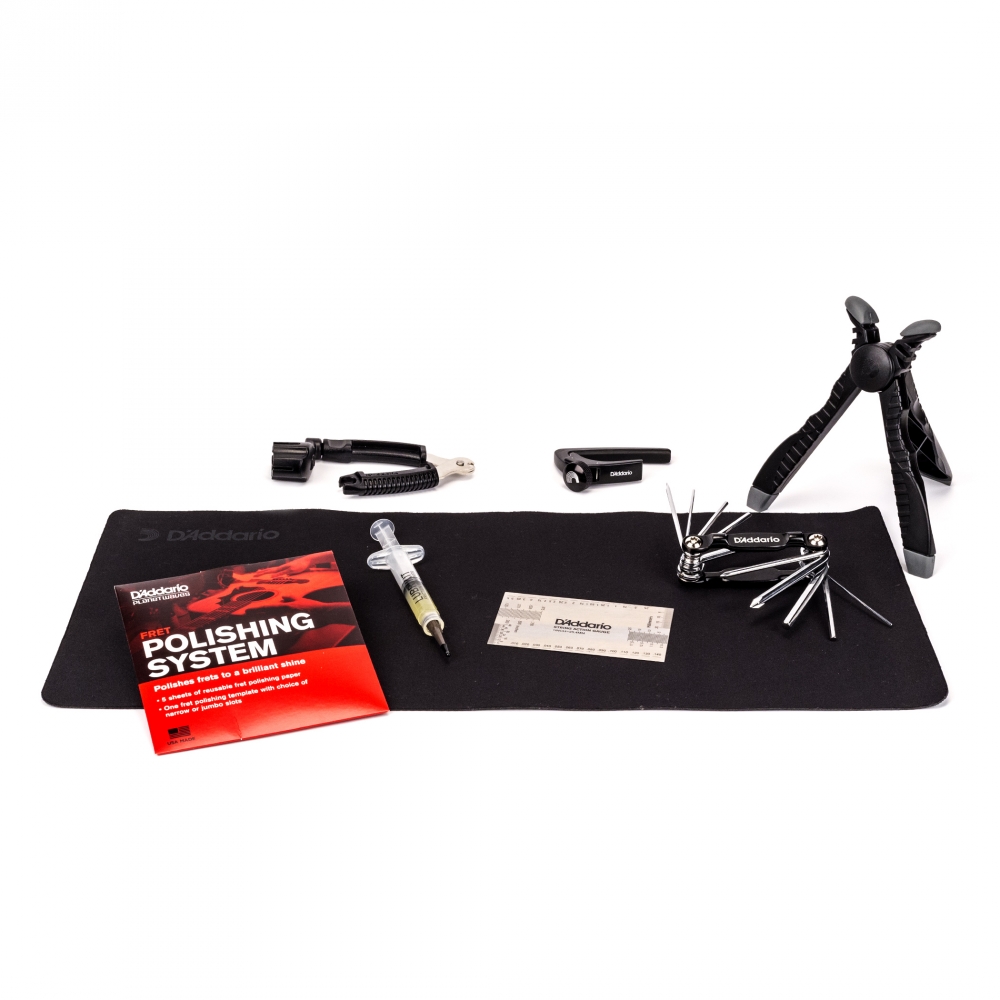 PW-EGMK-01 Guitar Maintenance Kit. Guitar Maintenance Kit inneholder alt du trenger for å få instrumentet ditt til å spille og låte så bra som mulig. Alt fra strengesveiv, nakkestøtte og multiverktøy, til vedlikeholds-produkter. Ganske enkelt alt du trenger i en lett å alltid ha med seg veske. • Inneholder de mest solgte produktene; Pro-Winder, Headstand, Multi-Tool, String Height Gauge, Lubrikit, Fret Polishing System, NS Capo Lite etc. • Høykvalitetsveske. • Alle verktøyene du trenger for instrumentjustering. • Tilgjengelig også i bassversjon. ALLE D'ADDARIOS CARE PRODUKTER ER SILIKONFRIE.