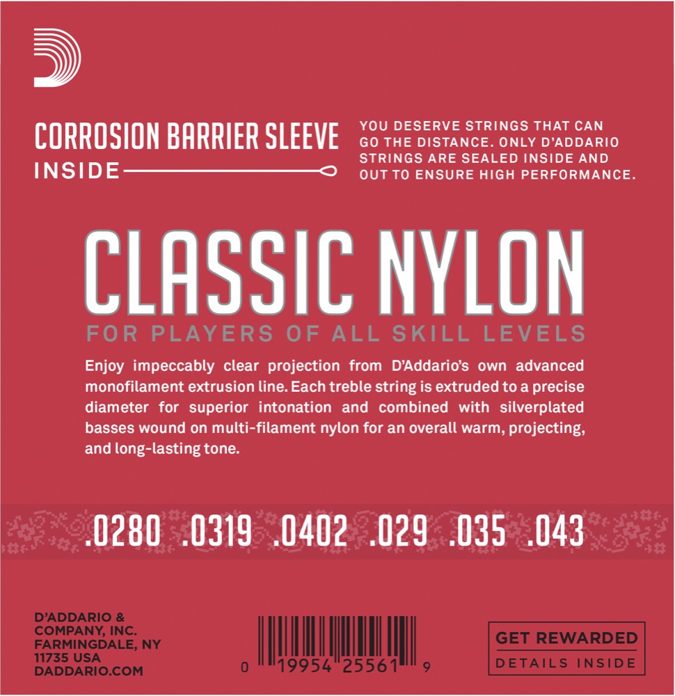 D’Addario J27N-3D Classic Nylon er et strengesett utviklet spesielt for nybegynnere og studenter på klassisk gitar. Dette er en 3-pakning med normal spenning, designet for å gi en balansert kombinasjon av komfortabel spillbarhet, varm klang og tydelig projeksjon.