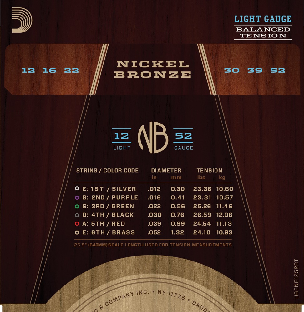 D'Addario NB1252BT Nickel Bronze Acoustic Guitar Strings, Balanced Tension Light, 12-52