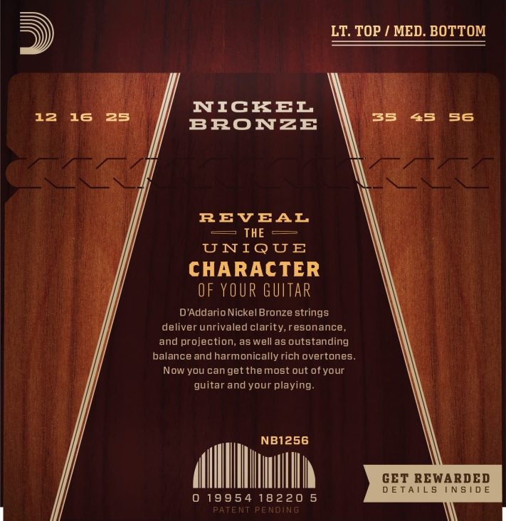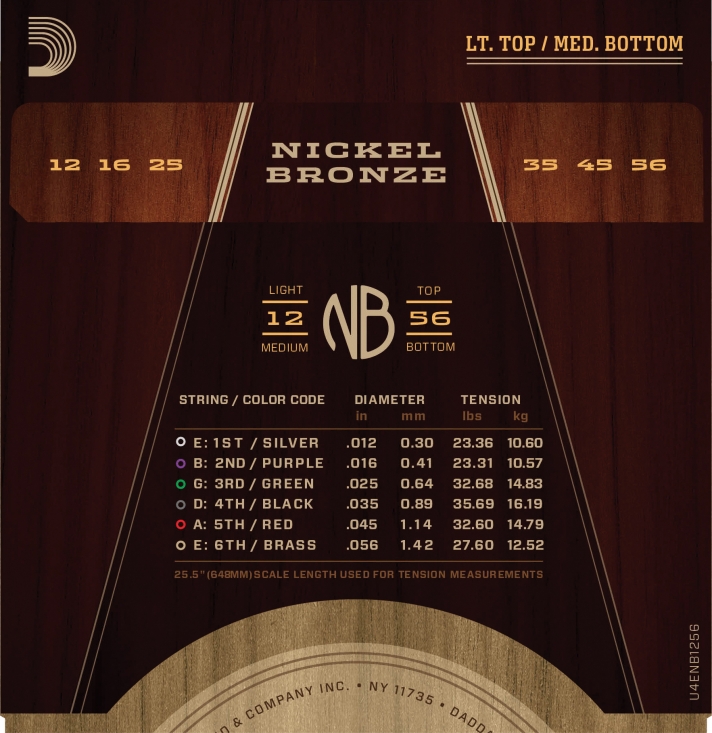 D'Addario NB1256 Nickel Bronze Acoustic Guitar Strings, Light Top / Med Bottom, 12-56
