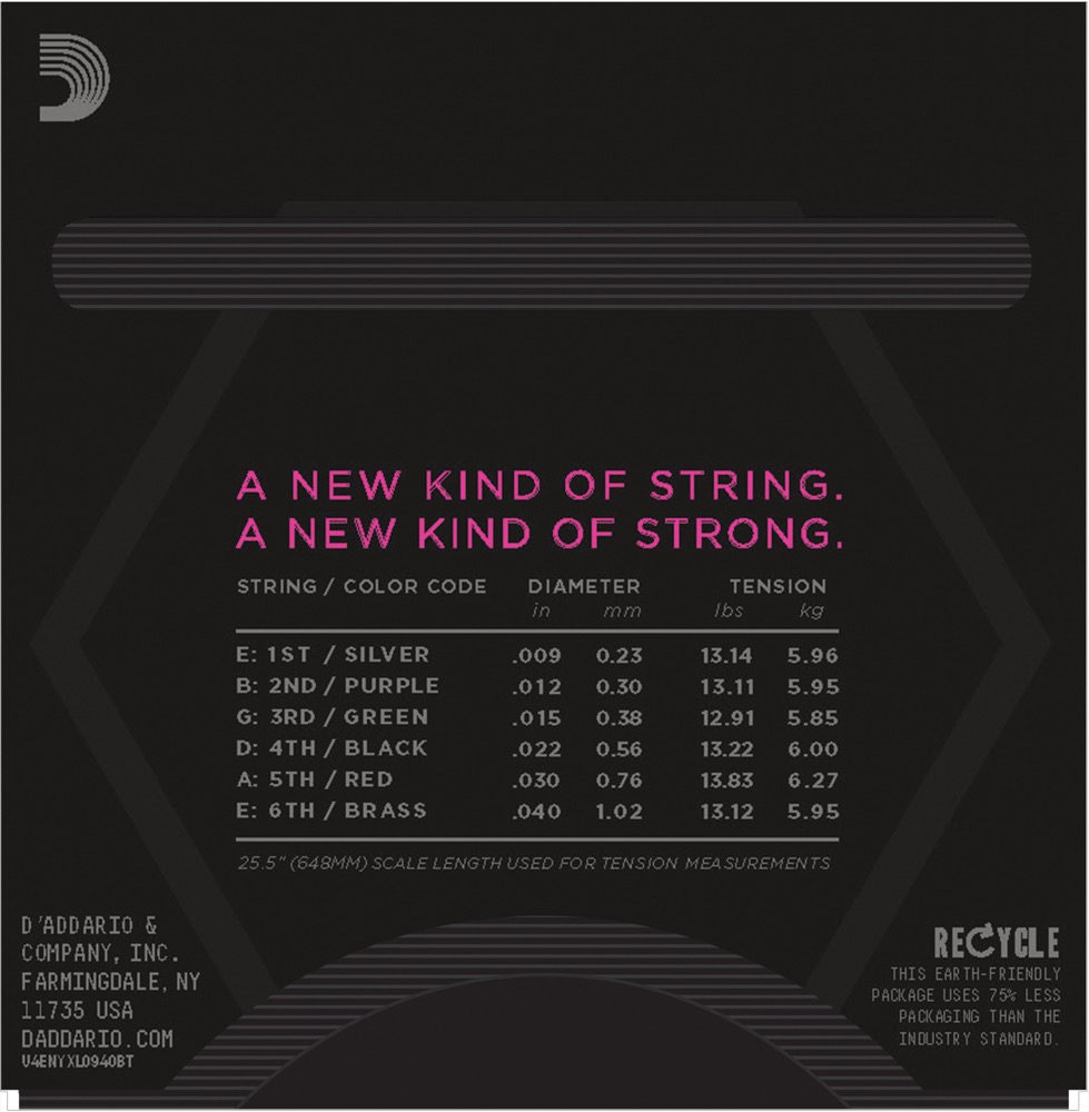 NYXL0940BT. Dette er det sterkeste sett med el.gitarstrenger D'Addario noensinne har produsert. Mere holdbart enn alle sine forgjengere, setter seg raskere når du strenger om, holder stemmingen bedre, spunnede strenger som har mere output og plain strenger som er mindre flate og mere livlige (lydmessig). Resultatet er noe som du aldrig har opplevd før, uovertruffen holdbarhet og stemmingsstabilitet. PLAY LOUD, PLAY STRONG, PLAY FEARLESSLY! Balanced Tension er et sett som er utviklet med matematiske beregninger for å få en optimal kombinasjon av strengetykkelser. Eller med andre ord, en balansert spenning og balansert motstand på alle strenger når de er stemt til pitch. Denne tilsynelatende lille endring gir et strengesettt som kjennes jevnere og mere balansert å spille på, klinger jevnere uten toner som stikker seg ut eller drukner, samt at vibrato og bends blir bedre og tryggere av at hånden slipper å kompensere for ulik hardhet i strengene når du spiller. • Nyutviklet kjerne av stål, for uovertruffen styrke og stemmingsstabilitet. • Mer magnetisk permeabilitet noe som gir høyere output i omfanget 2-5Khz for mere punch, crunch og bite! • Balansert spenning for balansert spilleteknikk. • Utviklet og produsert til sin perfeksjon av D'Addario i New York, USA. • Strengetykkelser: Plain Steel .009, .012, .015, Nikkel Wound .022, .030, .040.