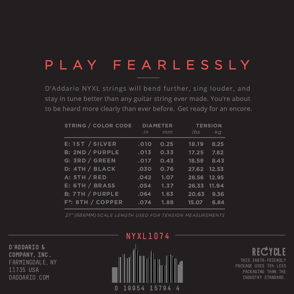 NYXL1074. 8-strengerssett. Dette er det sterkeste sett med el.gitarstrenger D'Addario noensinne har produsert. Mere holdbart enn alle sine forgjengere, setter seg raskere når du strenger om, holder stemmingen bedre, spunnede strenger som har mere output og plain strenger som er mindre flate og mere livlige (lydmessig). Resultatet er noe som du aldrig har opplevd før, uovertruffen holdbarhet og stemmingsstabilitet. PLAY LOUD, PLAY STRONG, PLAY FEARLESSLY! • Nyutviklet kjerne av stål, for uovertruffen styrke og stemmingsstabilitet. • Mer magnetisk permeabilitet noe som gir høyere output i omfanget 2-5Khz for mere punch, crunch og bite! • Utviklet og produsert til sin perfeksjon av D'Addario i New York, USA. • Strengetykkelser: Plain Steel: .010, .013, .017 Nikkel Wound: .030, .042, .054, .064, .074. • Optimerat for gitarer med 27 scale.