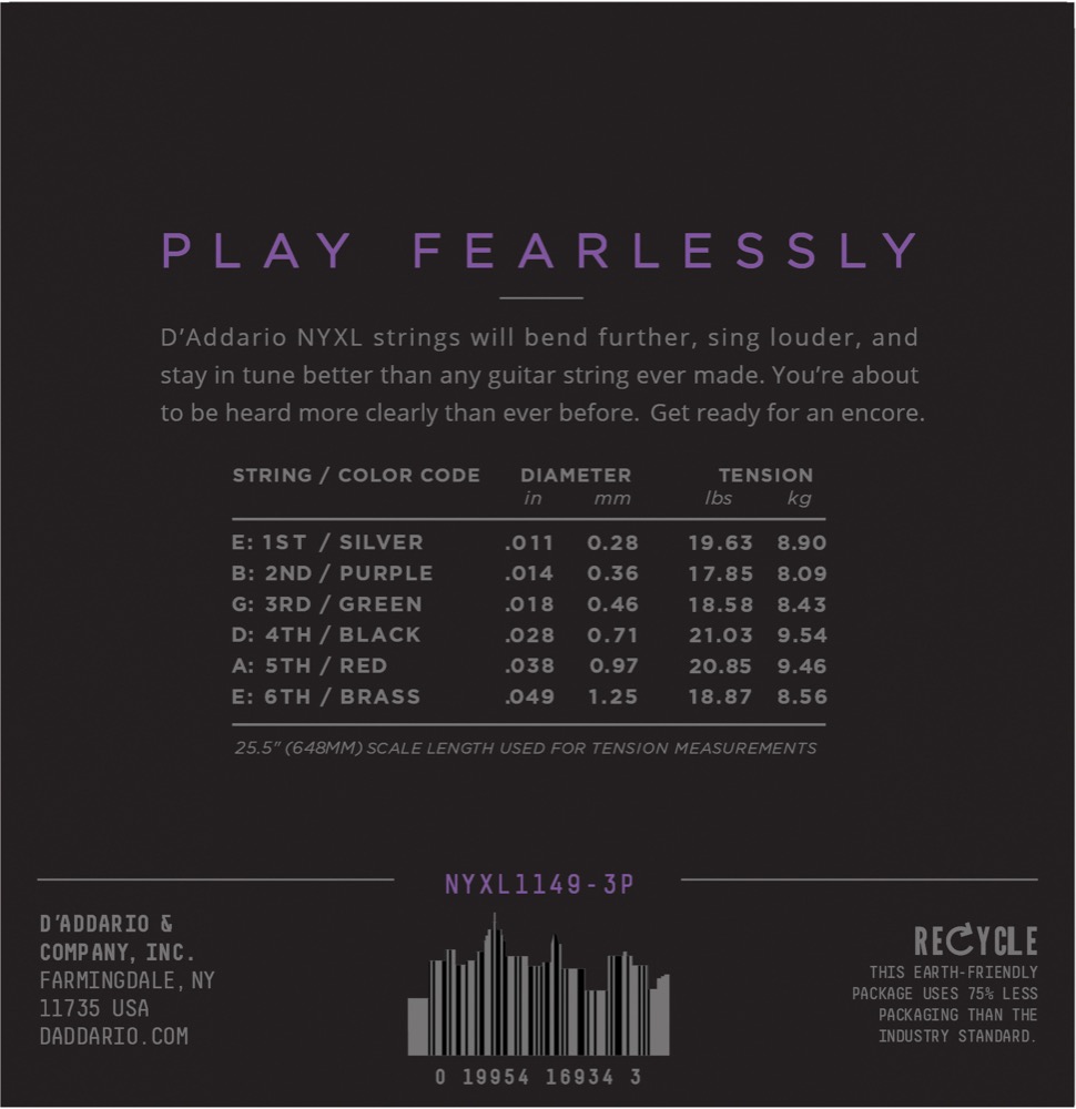 NYXL1149-3D Dette er det sterkeste settet med elektriske gitarstrenger D'Addario noensinne har laget. Mere holdbar enn alle forgjengere, setter seg raskere når du bytter strenger, holder stemmingen bedre, spunnede strenger som har mer output og Plain strenger som er mindre flate og mer livlige (lydmessig). Resultatet er noe du aldri har opplevd før, uovertruffen styrke og stemmingsstabilitet. PLAY LOUD, PLAY STRONG, PLAY FEARLESSLY! • Nyutviklet kjerne av stål, for uovertruffen styrke og stemmingsstabilitet. • Mer magnetisk permeabilitet noe som gir høyere output i omfanget 2-5Khz for mere punch, crunch og bite! • Balansert spenning for balansert spilleteknikk. • Utviklet og produsert til sin perfeksjon av D'Addario i New York, USA. • Strengetykkelser: Plain Steel .011, .014, .018, Nickel Wound .028, .038, .049.
