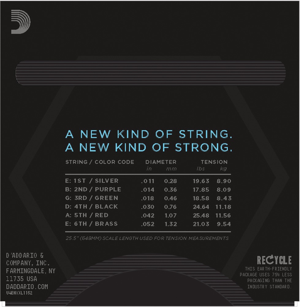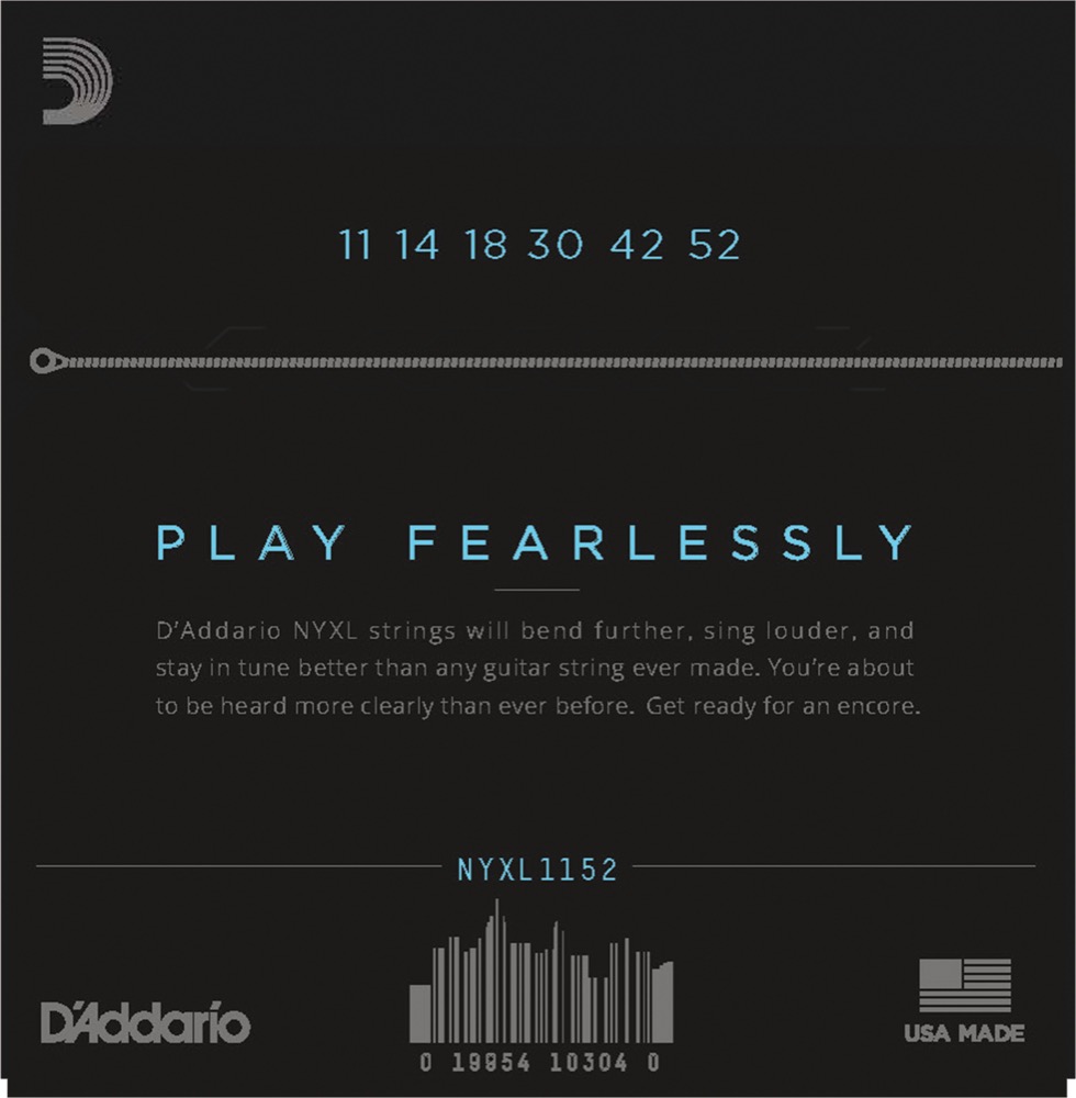 NYXL1152. Dette er det sterkeste sett med el.gitarstrenger D'Addario noensinne har produsert. Mere holdbart enn alle sine forgjengere, setter seg raskere når du strenger om, holder stemmingen bedre, spunnede strenger som har mere output og plain strenger som er mindre flate og mere livlige (lydmessig). Resultatet er noe som du aldrig har opplevd før, uovertruffen holdbarhet og stemmingsstabilitet. PLAY LOUD, PLAY STRONG, PLAY FEARLESSLY! • Nyutviklet kjerne av stål, for uovertruffen styrke og stemmingsstabilitet. • Mer magnetisk permeabilitet noe som gir høyere output i omfanget 2-5Khz for mere punch, crunch og bite! • Utviklet og produsert til sin perfeksjon av D'Addario i New York, USA. • Strengetykkelser: Plain Steel .011, .014, .018, Nikkel Wound .030, .042, .052.
