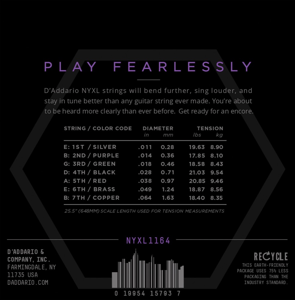 NYXL1164. 7-strengerssett. Dette er det sterkeste sett med el.gitarstrenger D'Addario noensinne har produsert. Mere holdbart enn alle sine forgjengere, setter seg raskere når du strenger om, holder stemmingen bedre, spunnede strenger som har mere output og plain strenger som er mindre flate og mere livlige (lydmessig). Resultatet er noe som du aldrig har opplevd før, uovertruffen holdbarhet og stemmingsstabilitet. PLAY LOUD, PLAY STRONG, PLAY FEARLESSLY! • Nyutviklet kjerne av stål, for uovertruffen styrke og stemmingsstabilitet. • Mer magnetisk permeabilitet noe som gir høyere output i omfanget 2-5Khz for mere punch, crunch og bite! • Utviklet og produsert til sin perfeksjon av D'Addario i New York, USA. • Strengetykkelser: Plain Steel: .011, .014, .018 Nikkel Wound: .028, .038, .049, .064.