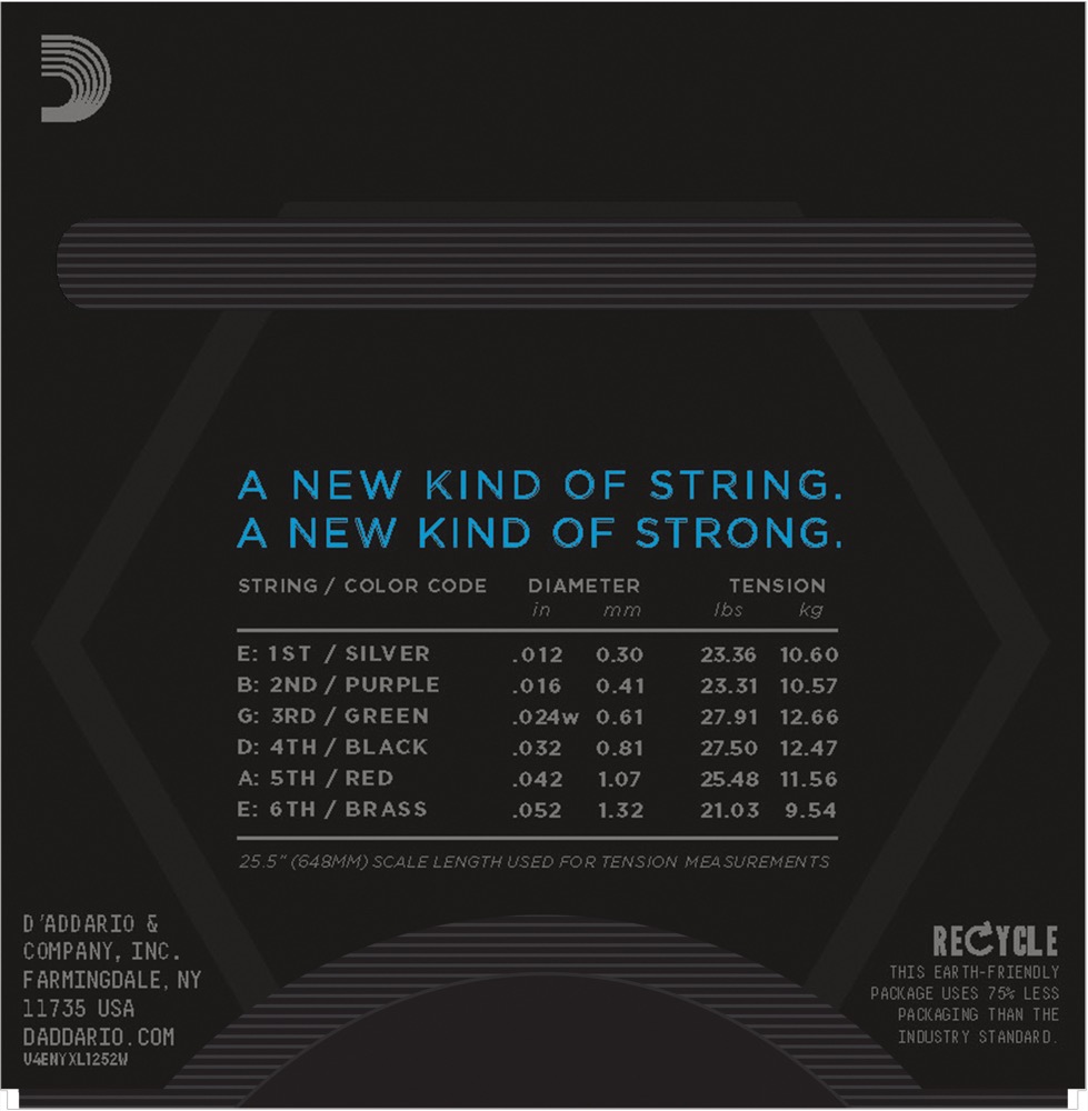 NYXL1252W med spunnet 3dje streng. Dette er det sterkeste sett med el.gitarstrenger D'Addario noensinne har produsert. Mere holdbart enn alle sine forgjengere, setter seg raskere når du strenger om, holder stemmingen bedre, spunnede strenger som har mere output og plain strenger som er mindre flate og mere livlige (lydmessig). Resultatet er noe som du aldrig har opplevd før, uovertruffen holdbarhet og stemmingsstabilitet. PLAY LOUD, PLAY STRONG, PLAY FEARLESSLY! • Nyutviklet kjerne av stål, for uovertruffen styrke og stemmingsstabilitet. • Mer magnetisk permeabilitet noe som gir høyere output i omfanget 2-5Khz for mere punch, crunch og bite! • Utviklet og produsert til sin perfeksjon av D'Addario i New York, USA. • Strengetykkelser: Plain Steel .012, .016, Nikkel Wound .024, .032, .042, .052.