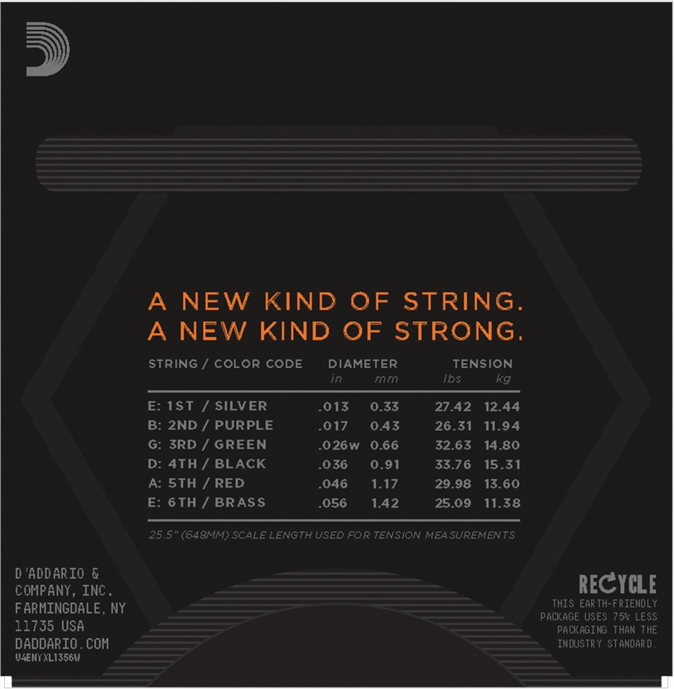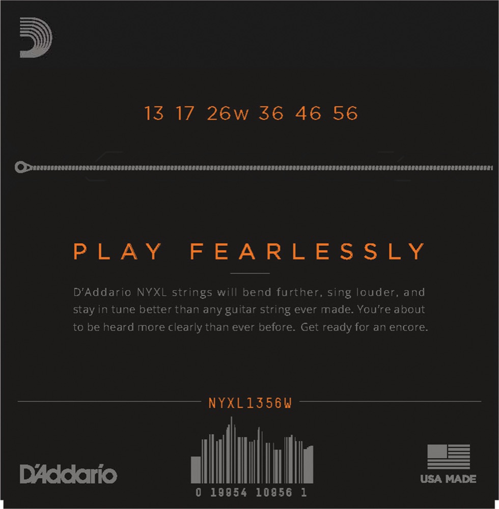 NYXL1356W med spunnet 3dje streng. Dette er det sterkeste sett med el.gitarstrenger D'Addario noensinne har produsert. Mere holdbart enn alle sine forgjengere, setter seg raskere når du strenger om, holder stemmingen bedre, spunnede strenger som har mere output og plain strenger som er mindre flate og mere livlige (lydmessig). Resultatet er noe som du aldrig har opplevd før, uovertruffen holdbarhet og stemmingsstabilitet. PLAY LOUD, PLAY STRONG, PLAY FEARLESSLY! • Nyutviklet kjerne av stål, for uovertruffen styrke og stemmingsstabilitet. • Mer magnetisk permeabilitet noe som gir høyere output i omfanget 2-5Khz for mere punch, crunch og bite! • Utviklet og produsert til sin perfeksjon av D'Addario i New York, USA. • Strengetykkelser: Plain Steel .013, .017, Nikkel Wound .026, .036, .046, .056.