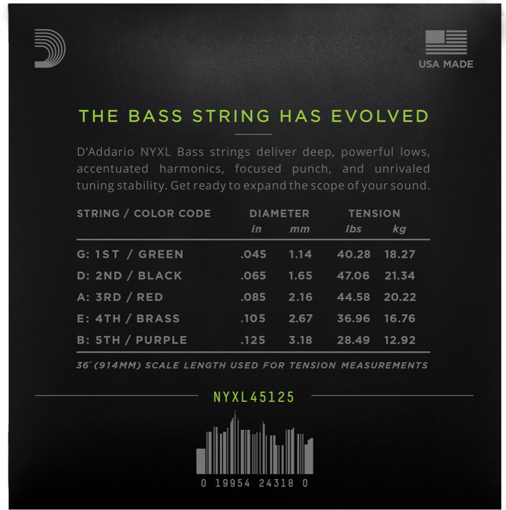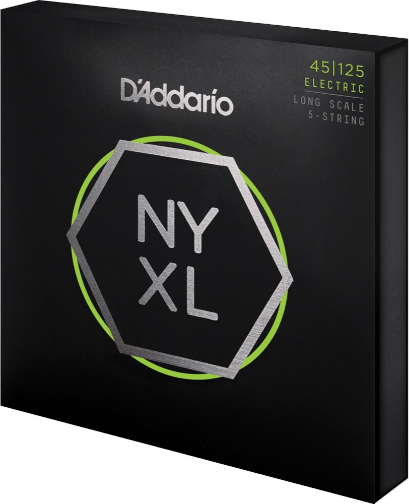 NYXL45125, Set Long Scale, Light Top/Medium Bottom 5-String, 45-125. NYXL Bass kombinerer D'Addarios stålkullkjerne, NY STEEL, med en omgjort nikkelbelagt stålspinning. Denne konstruksjonen gir en dyp og kraftig basstone, med et fokusert, stramt og punchy mellomtoneregister, samt et komplekst overtoneregister. Designet for alle spillestiler har NYXL Bass et større dynamisk omfang og en lengre sustain enn noen annen basstreng. • Omgjort forhold mellom strengens kjerne og spinning for en mere allsidig streng. • Omgjort NYXL nikkelbelagt spinning for behagelig spillefølelse og fremhevede overtoner. • D'Addarios NY STEEL stålkullkjerne for uovertruffen holdbarhet og stemmingsstabilitet. • Passer Long-Scale basser opp til 36 1/4 . • Produsert til sin fullkommenhet i New York, USA. • Strengetykkelser: NYXL Nikkel Wound .045, .065, .080, .100, .125.