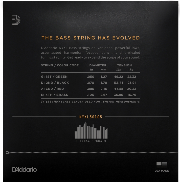 NYXL50105, Set Long Scale, Medium, 50-105. NYXL Bass kombinerer D'Addarios stålkullkjerne, NY STEEL, med en omgjort nikkelbelagt stålspinning. Denne konstruksjonen gir en dyp og kraftig basstone, med et fokusert, stramt og punchy mellomtoneregister, samt et komplekst overtoneregister. Designet for alle spillestiler har NYXL Bass et større dynamisk omfang og en lengre sustain enn noen annen basstreng. • Omgjort forhold mellom strengens kjerne og spinning for en mere allsidig streng. • Omgjort NYXL nikkelbelagt spinning for behagelig spillefølelse og fremhevede overtoner. • D'Addarios NY STEEL stålkullkjerne for uovertruffen holdbarhet og stemmingsstabilitet. • Passer Long-Scale basser opp til 36 1/4 . • Produsert til sin fullkommenhet i New York, USA. • Strengetykkelser: NYXL Nikkel Wound .050, .070, .085, .105.