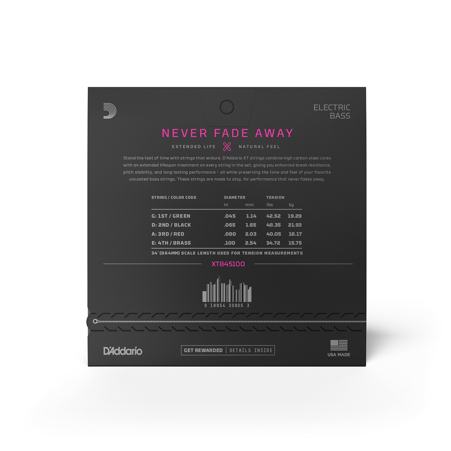 XTB45100. Strengesett El.bass XT Coated 045-100 Regular Light, Long scale. Hver enkelte streng i et sett XT er behandlet med D’Addario’s beskyttende microcoating. En supertynn overflatebehandling som effektivt støter bort smuss og svette. XT-strengene varer 4 ganger lengre enn tradisjonelle u-coatede strenger, uten å påvirke tonen eller spillefølelsen som D’Addario’s strenger har blitt kjent for. D’Addario’s unike karbonstålkjerne, i kombinasjon med en sterk forankring av kulen, såkalt Fusion Twist Technology, gir en streng med uovertruffen styrke og somholder stemmingen betraktelig bedre enn vanlige strenger. • D’Addario’s mikroskopiske coating gjør at strengene kjennes ferske og holder tonen 4 ganger lengre. • Kjerne av karbonstål og ‘’Fusion Twist’’ forankring av kulen, for uovertruffen styrke og stemmingsstabilitet. • Forseglbar og korrosjonsresistent forpakning garanterer alltid et sett ferske strenger. • Utviklet og produsert til sin perfeksjon av D'Addario i New York, USA. • Nickel Wound .045, .065, .080, .100.