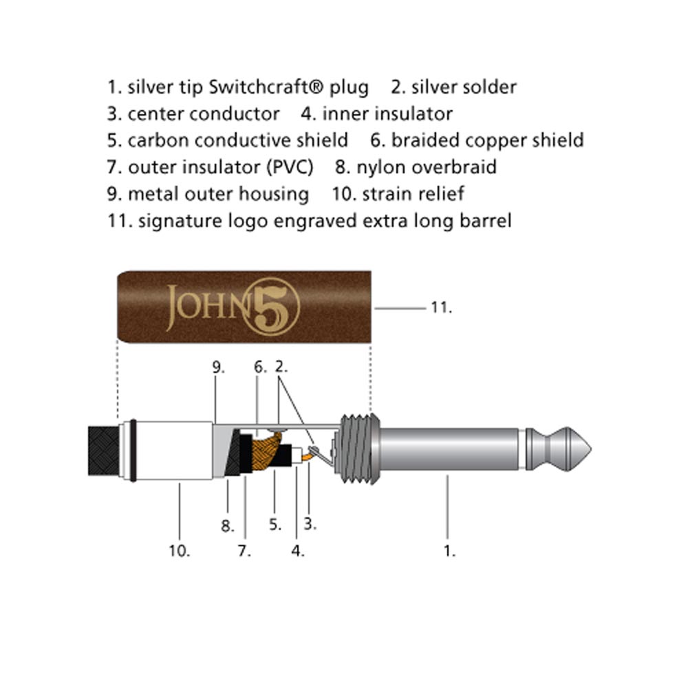 John 5 Signature Cable EP1710J5 Specs - Wire Gauge: AWG 20 (0.519 mm2) - Diameter: 0.237 in. (6.02 mm) - Insulation: Polyethylene inner with PVC outer - Capacitance: 33.27 pF/ft (109pF/M) - Shield & Material: Copper Braid + Conductive PVC 78% - Jacket & Material: PVC + Nylon Overbraid - Resistance: 8.8 ohm/1,000 ft (29 ohm/KM) - Inductance: 0.07 µH/ft (0.2 µH/M) - Termination Method: Silver Solder