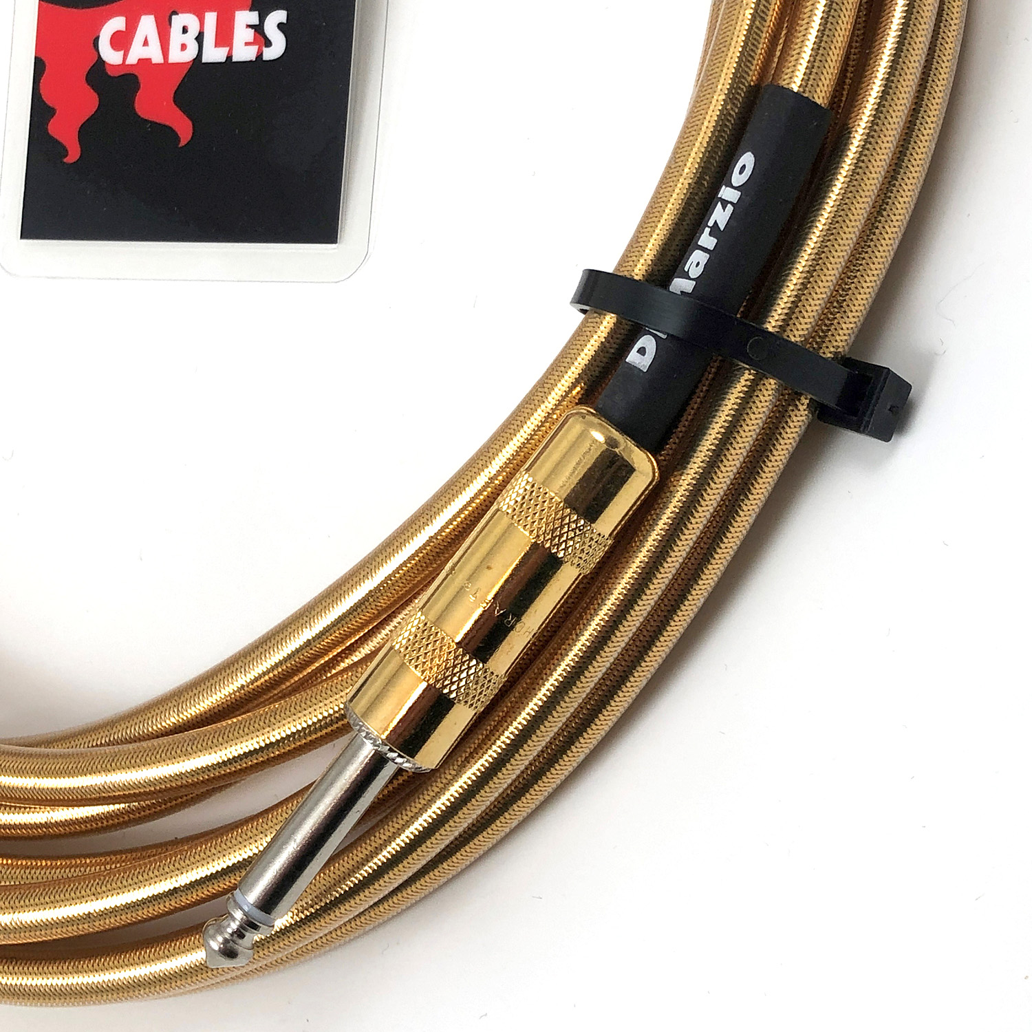 EP1718SSGM Gold Metallic Instrument Cable. 5.4m. DiMarzio® Guitar & Instrument Cables are unsurpassed for connecting guitars, basses and keyboards to amps. Exceptionally crisp, clear, quiet and durable, they outperform cables costing much more. They've been called the new industry standard, and have successfully passed Guitar Player magazine's chop and jump rope tests as well as many other torture tests. Custom designed low-capacitance American-made copper cable ensures low stage noise and guarantees consistent sound and improved high frequency response. DiMarzio® Instrument Cables are encased in a durable nylon braided jacket which is designed to lie flat, decrease tangling and protect the cable. DiMarzio® Instrument Cables come in 6-foot, 10-foot, 15-foot, 18-foot and 21-foot lengths. Right angle and silent ends are available. All DiMarzio® cables are hand made in our NYC factory. Spec. - Wire Gauge: AWG 20 (0.519 mm2) - Diameter: 0.237 in. (6.02 mm) - Insulation: Polyethylene inner with PVC outer - Capacitance: 33.27 pF/ft (109pF/M) - Shield & Material: Copper Braid + Conductive PVC 98% - Jacket & Material: PVC + Nylon Overbraid - Resistance: 8.8 ohm/1,000 ft (29 ohm/KM) - Inductance: 0.07 µH/ft (0.2 µH/M) - Termination Method: Silver Solder