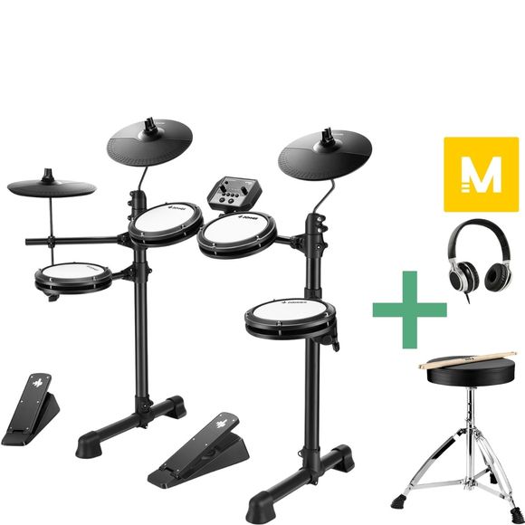 Det følger med trommestol, hodetelefoner og trommestikker