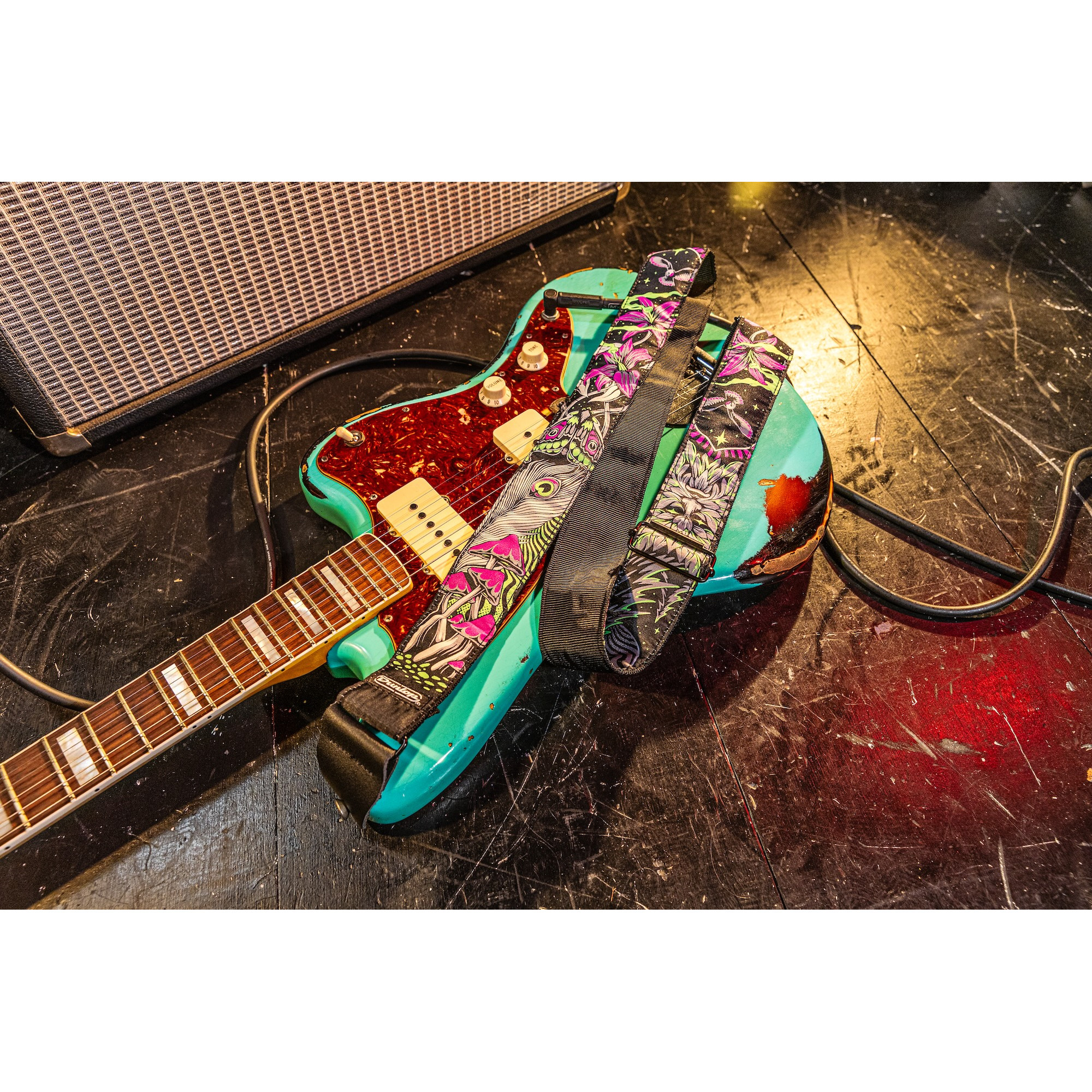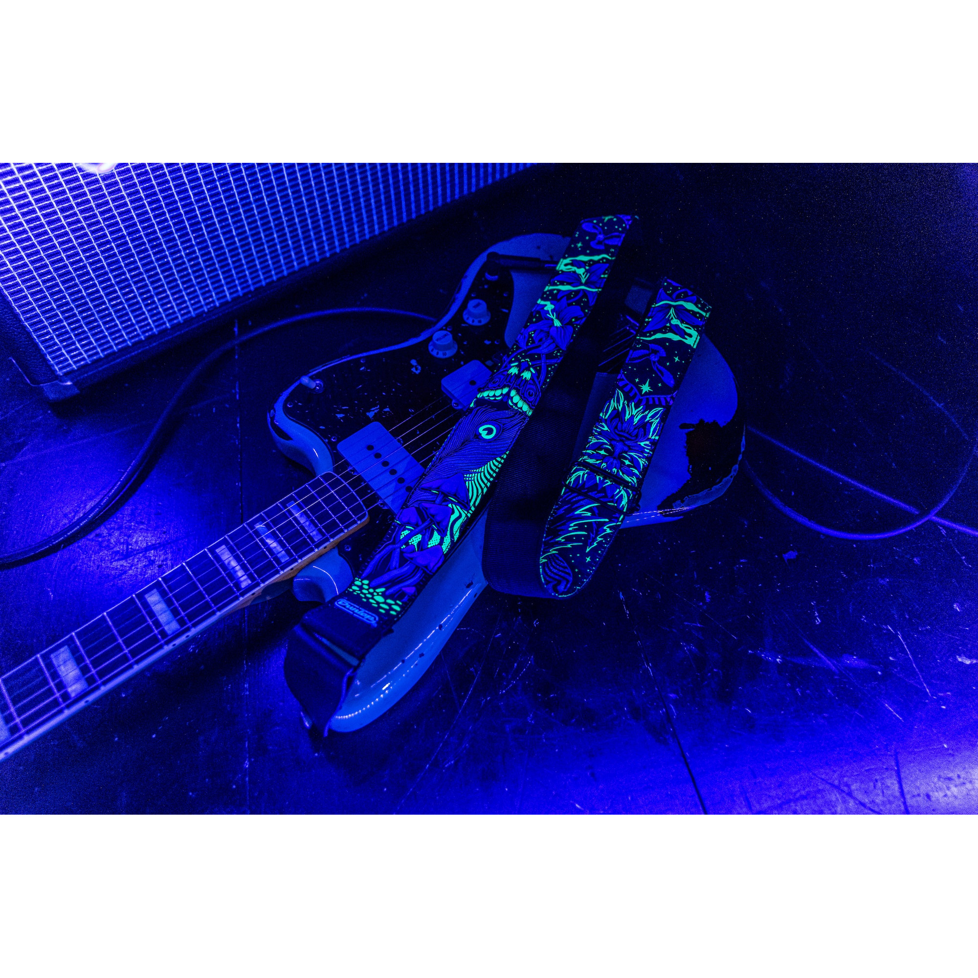 Dunlop D6734 Jacquard Night Trip Strap er en gitarreim med et grafisk design illustrert av Simon Berndt, også kjent som One Horse Town. Mønsteret er utviklet med en blacklight-reaktiv effekt som blir synlig når scenelyset dempes.