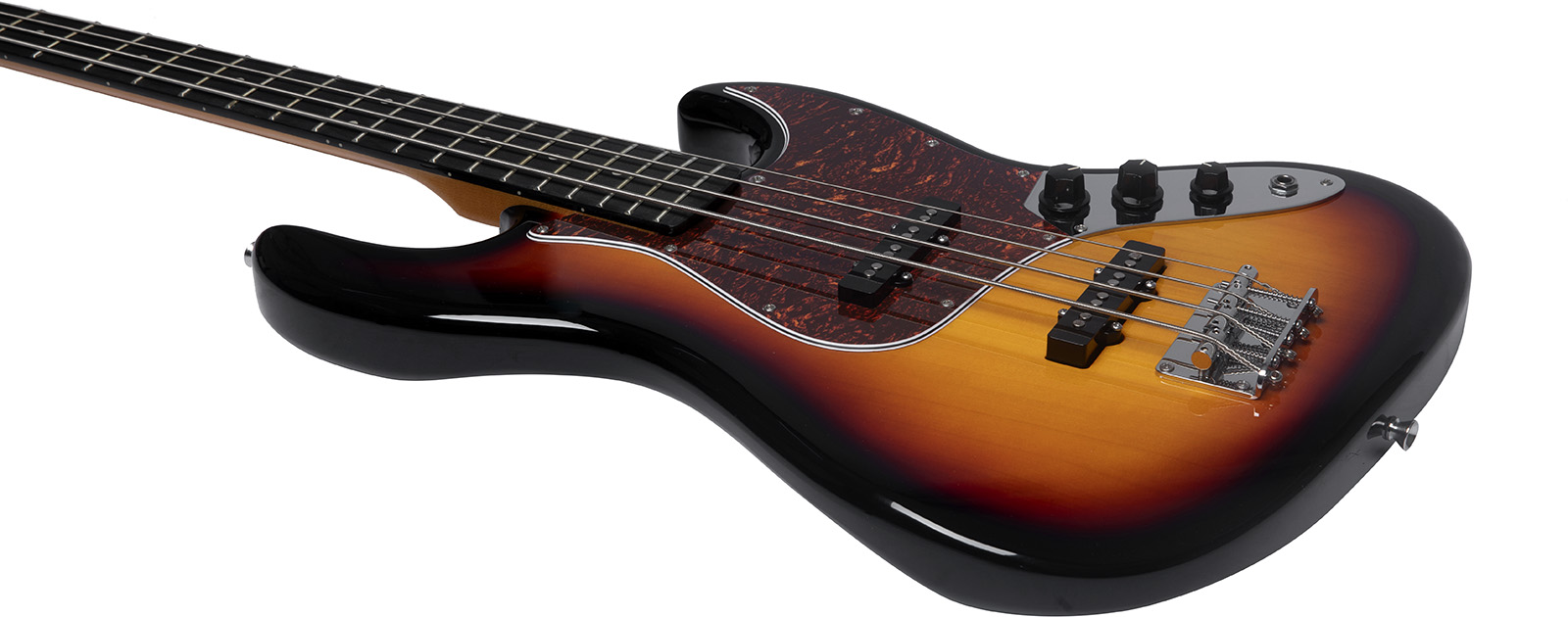 JB300-SB kombinerer klassisk offset-design med dobbel cutaway og elegant Sunburst gloss finish. Poppelkroppen og den solide lønnehalsen med laurel gripebrett gir stabilitet og komfort, mens to J-type single-coil pickups gir fleksibel lyd fra klar til perkusiv. Individuelle volumkontroller og generell tonekontroll lar deg mikse pickup-karakterer for ønsket klang. Broen med justerbare sadler sikrer optimal intonasjon og sustain, og det vintage-inspirerte pickguardet fullfører det klassiske utseendet.