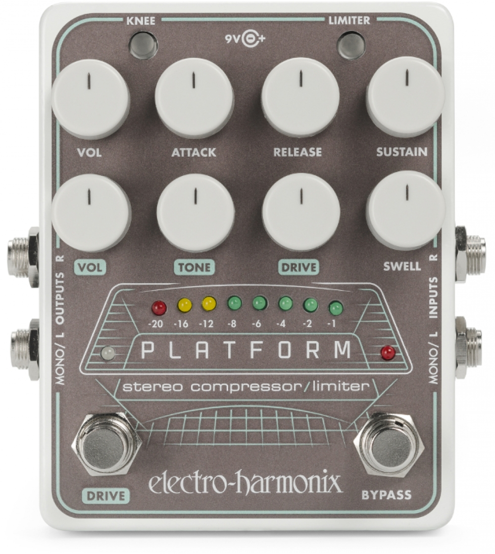 The PLATFORM is a sophisticated, professional stereo compressor limiter that includes volume swell and tape reverse, plus overdrive. Quick Specs -Studio-quality compressor/limiter lets the user precisely tune dynamics regardless of the instrument or situation. -The compressor/limiter includes a full complement of controls: Volume, Attack, Release and Sustain, plus pushbuttons for Hard or Soft Knee and the Limiter. -Foot-switchable overdrive section adds versatility and includes dedicated controls for Volume, Tone and Drive. Together with the compressor it produces a sound that’s saturated, smooth and slippery. -Adjustable Swell function creates bowed, fade in and reverse effects. -True stereo operation, can be used as Mono In and Out, Mono In and Stereo Out, or Stereo In and Stereo Out. -Features a three color, eight LED compression meter that displays the compressor’s actual gain reduction in real-time. -Stereo buffered bypass that’s great for keeping your signal pristine with multiple pedal setups and long cable runs. -Comes with an EHX9.6DC-200mA power supply. Demo Video User Manual: https://www.ehx.com/assets/instructions/platform.pdf Shipping Weight: 1.6 lbs. Shipping Dimensions (L x W x H): 7.25" x 6.2" x 3.25" Unboxed Weight: TBD Unboxed Dimensions (L x W x H): TBD UPC: 683274011936