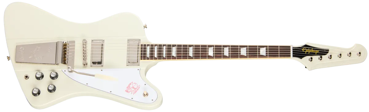 Epiphone 1963 Firebird V Reissue med Maestro Vibrola er utviklet i samarbeid med Gibson Custom og gjenskaper den ikoniske modellen fra 1963, opprinnelig designet av Ray Dietrich. Firebird var Gibsons første neck-through-body-gitar og ble raskt et særpreget alternativ i sortimentet, kjent for sin lange sustain, tydelige attack og karakteristiske design.