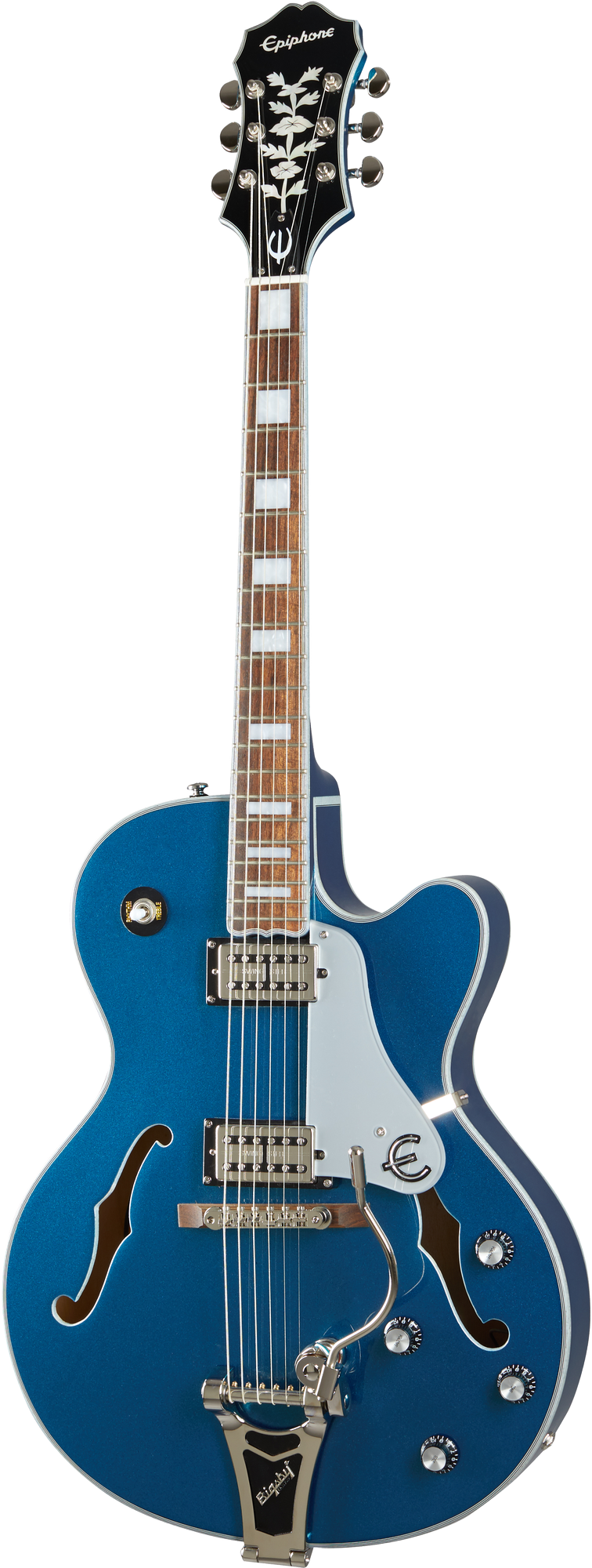 A Versatile Hollowbody ClassicThe Epiphone Emperor Swingster™ is a way-cool guitar that excels in a wide range of genres, including jazz, blues, rockabilly, country and rock. This hollowbody has a 5-ply layered maple body, mahogany neck with a comfortable and fast-playing SlimTaper™ profile, Indian laurel fretboard with block inlays, mother of pearl Epiphone and Tree of Life inlays on the large Clipped Dove Wing headstock, Grover® Rotomatic® tuning machines, and two Epiphone SwingBucker™ pickups, each with a dedicated volume and tone control. Push/pull switches are built into each volume control to provide series/parallel switching for the pickups, and along with the 3-way toggle pickup selector switch, give you a broad selection of tonal options. The LockTone™ Tune-O-Matic™ bridge is mounted on a pinned wooden base so it won't move out of place when you use the licensed Bigsby® vibrato with wire handle. Available in Forest Green Metallic with gold hardware, or Black Aged Gloss and Delta Blue Metallic finishes with nickel hardware.